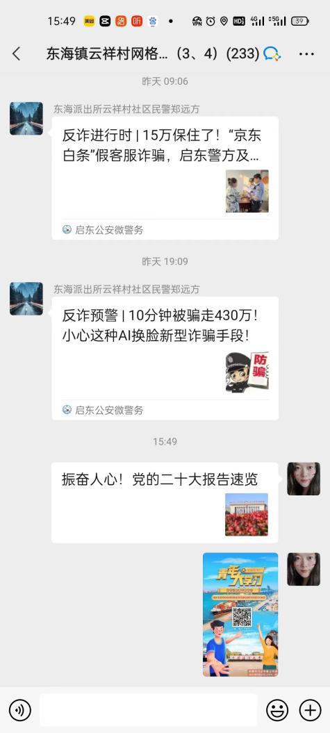 在云祥村生活多年的党员秦解平如今又有了一个新的职务——第二网格线上网格员,负责线上收集网格内各类矛盾纠纷调解、民生诉求等工作,及时了解网格内发生的大事小事。“我家朝东屋门口漏水,大家有可靠的水工师傅推荐吗”“网格员,你好,我想申请尊老金,要怎么办理呢”……从早到晚,这样“热火朝天”的景象分布在全镇各个云角落,群里的居民问得活跃,线上网格员回得及时,充分提高了网格治理工作效能,织密了东海线上线下“连心网”。