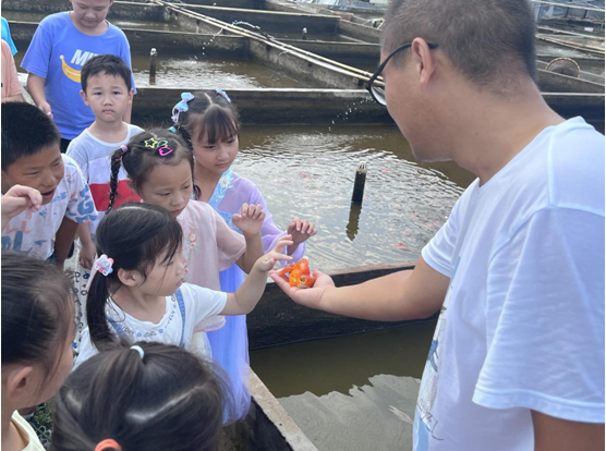 在培训结束后,还举办了主题为“‘鱼’你一起 ‘童’享快乐”的亲子活动,让孩子们丰富知识的同时参与课外实践。金鱼养殖达人施浩文带领小朋友们参观金鱼养殖基地,了解不同金鱼的习性以及养殖技巧等。巾帼志愿者们还播放了“渔夫和金鱼”故事的视频,让孩子从寓言故事了解人生哲学,树立正确价值观、人生观。最后,开展趣味捞金鱼活动,现场水花飞溅、欢声笑语一片,孩子们在“鱼池”里一显身手,十分热闹。