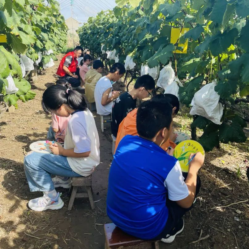 唐慨澄老伯向孩子们讲述葡萄种植的故事,孩子们连连点头称赞。听完故事,大家发挥丰富想象力,绘制色彩斑斓的葡萄团扇,扇面上提了几许小字,书写他们对阅读的理解,一笔一画间,助力振兴加速度。