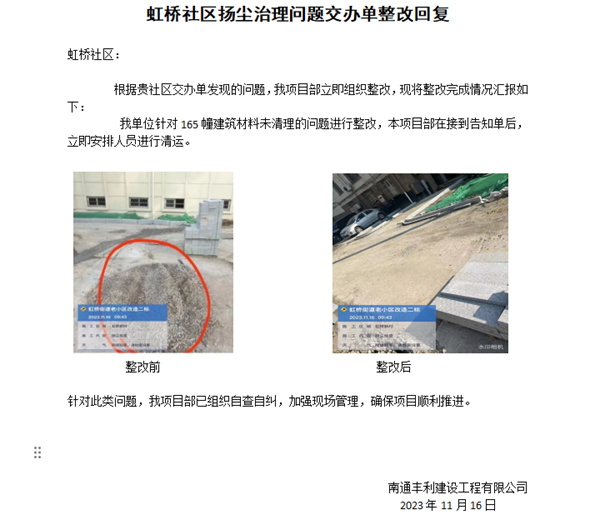 “老旧小区改造中,扬尘问题不可避免,作为扬尘管控示范社区,我们以‘交办单、自查单、测评单’为问题导向,更专业地做好管理服务工作并查评效果。”百姓管家顾昌岭说道。在一份日巡查的自查单中,顾昌岭记录下虹桥新村165幢周边建筑材料未清理、未覆盖,存在扬尘问题。随即自查单经由社区流转至施工队项目部,并于当天处置完毕。“我是不满意施工队在机械施工的时候,灰尘飘到家里来了。”填出不满意测评的李大伯说道。为此,社区与施工队一同优化施工方式,每次机械施工时都会同步配合洒水作业,对“第一现场”也会做好及时清扫,获得了认可。