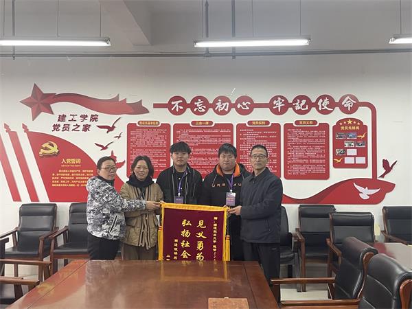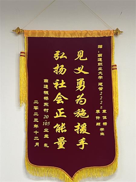 中国江苏网1月8日南通讯 新年伊始,南通职业大学建管222Z班季许颖、袁佳杨同学收到了“见义勇为施援手、弘扬社会正能量”这样一面红绒烫金大字锦旗,在天寒地冻的时节诠释了南通职大青年火热的青春风采!