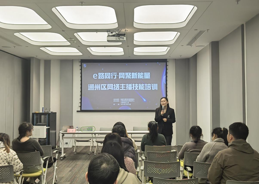 中国江苏网4月2日南通讯 近日,南通市通州区委网信办,通州区网络直播行业联合党委、工会联合会和川姜镇信息化网络中心、川姜镇总工会联合举办的“e路同行·网聚新能量”全区网络主播技能培训在川姜镇纤意坊生活美学馆四楼会议室举行。此次培训旨在提升全区网络主播的专业技能,帮助他们更好地适应网络直播行业的发展趋势,充分发挥网络直播在传播正能量的作用,增强行业的凝聚力、创造力,积极为通州区社会经济高质量发展赋能增效。