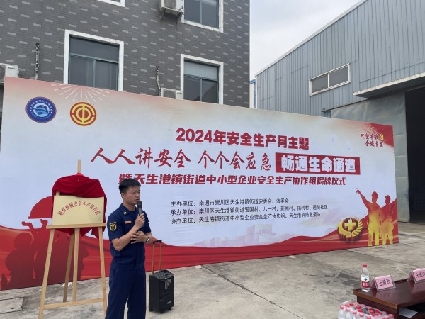 中国江苏网6月18日南通讯 为增强全民安全意识,营造浓厚的安全文化氛围,日前,南通市崇川区天生港镇街道办事处、总工会联合天生港消防救援站、天生港镇街道中小型企业安全生产协作组,共同举办了2024年安全生产月启动暨中小型企业安全生产协作组揭牌仪式,辖区内各村社区安全员及企业代表、中小型企业安全生产协作组成员共计70余人参加。