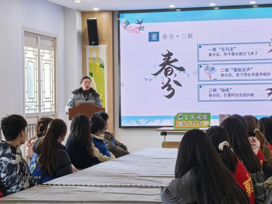 书声琅琅诵春分。走进崇川区新时代文明实践中心活动室,一场关于春分文化的学习活动在此开展。学生们全神贯注,聆听崇川区阅读推广人吴丹丹解读春分背后的文化内涵。在吴丹丹绘声绘色的讲解下,春分不再仅仅是书本上的文字,而是化为同学们眼前、身边可感可知的现实意象,使大家对二十四节气有了更为深刻的认识。“同学们,在这美好的春日里,让我们一同学习清代顾贞观的《柳梢青・花朝春分》,趁取春光,还留一半,莫负今朝!”随后,在吴丹丹的带领下,同学们齐声诵读诗句,领略到诗词里春分的独特魅力,进一步感受中华传统文化的博大精深。
