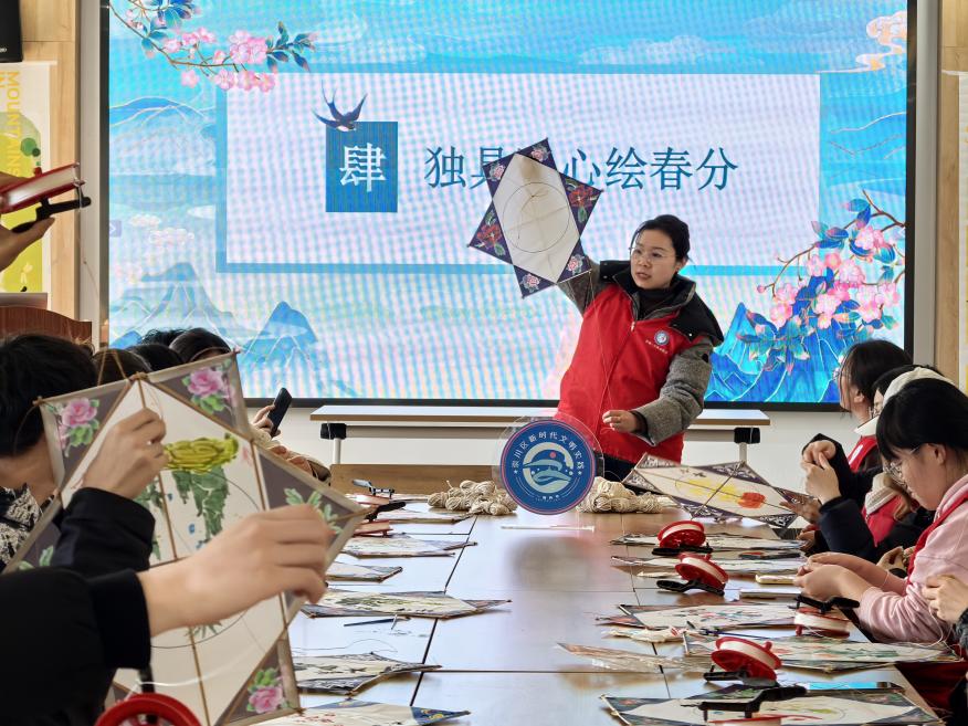 独具匠心绘春分。春分时节,民间常有放纸鸢的风俗,本次活动特别邀请南通板鹞非遗代表性传承人姚春华为同学们搭建纸鸢框架,化繁为简,帮助大家简明清晰地认识纸鸢的结构。同学们认真听姚春华讲解纸鸢的历史文化与放飞技巧,仔细观察自己的纸鸢,提起画笔,在空白区域内涂画出对二十四节气的理解与感悟。在明媚春光里,同学们走入广场、草地,放飞亲手制作的纸鸢,感受春风拂面、纸鸢翱翔的快乐,寄托对美好未来的憧憬。