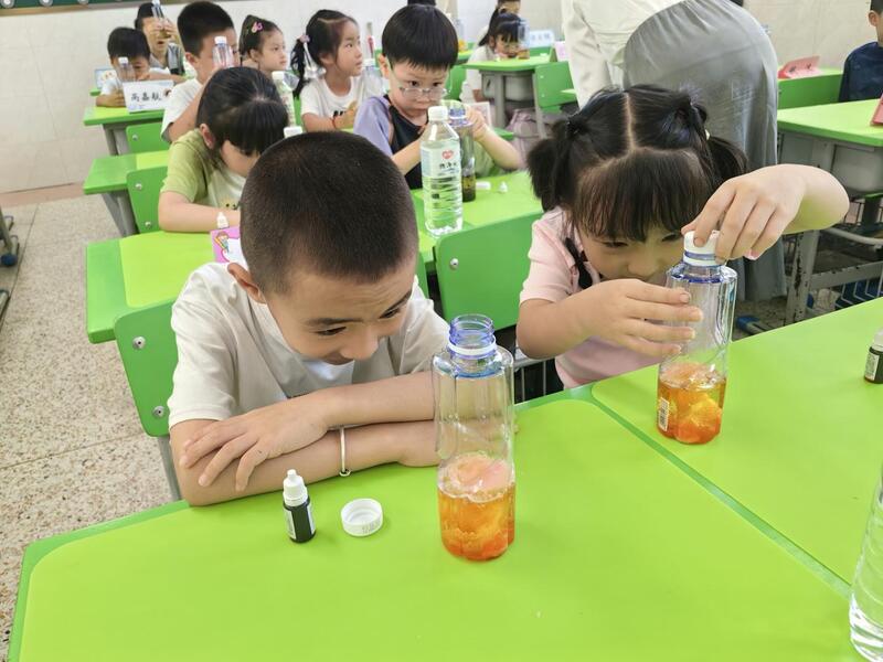 随着“五彩熔岩情绪瓶”科普实验的开始,活动也进入了高潮环节。在新时代文明实践站志愿者指导下,孩子们将食用油、水、色素分层依次装入透明瓶中,每一层代表一种情绪状态。摇晃瓶子后,液体混合又逐渐分离,模拟了情绪从混乱恢复平静的过程。加入泡腾片后,瓶内顿时“火山喷发”,引来小朋友们阵阵惊呼。孩子们盯着逐渐平复的气泡恍然大悟:“原来生气就像这冒泡的瓶子。等泡泡消失了,情绪也就慢慢冷静下来了。”简单的实验将抽象的情绪变化变得直观,让孩子们在惊叹与欢笑中埋下了自我觉察与情绪管理的种子。三桥社区关工委负责人表示,未来社区将继续与学校联动,开展更多心理健康教育系列活动,并鼓励家长积极参与,构建家校社协同共育的良好生态。
