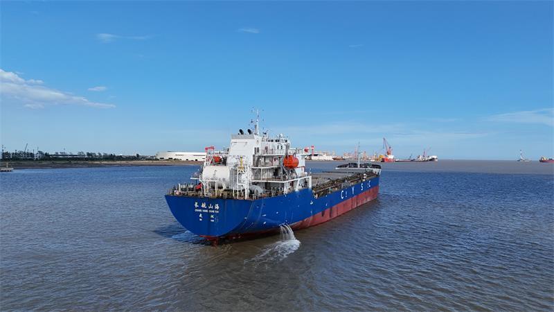 中国江苏网讯 9月25日,南通中集太平洋海洋工程有限公司建造的12500吨清洁能源江海直达干散货船“长航山海”轮,在南通海事局的现场监管维护下,从南通启东顺利出江,驶往东海海域开展试航。该船是此系列四艘新一代清洁能源干散货船的收官之作。