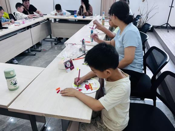 随后,活动进入手工团扇制作环节。社区工作人员提前准备好了制作团扇的材料,包括扇骨、挂饰、水彩笔等。活动现场温馨有趣,有的小朋友遇到困难时,邻座的小伙伴主动帮忙;亲子家庭分工协作,家长帮忙固定扇面,孩子专注地点缀绘画。不一会儿,一个个精美的团扇在大家的手中逐渐成型。原本空空如也的团扇上瞬间花团锦簇,每一把团扇都蕴含着大家对中秋佳节的美好祝福。手工制作活动不仅培养了孩子们的动手能力,更增进了亲子间的互动交流。