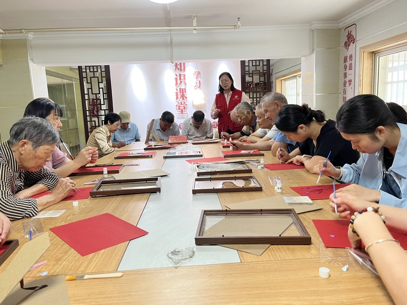 活动伊始,志愿者向居民们详细介绍了金箔画的历史文化背景,以及金箔画的创作思路及技巧。“金箔寓意珍贵美好,就像皎皎明月一样值得珍惜。”志愿者一边耐心讲解,一边认真示范,通过一番巧妙的绘制、粘贴等工序,制作出一副精美的作品。