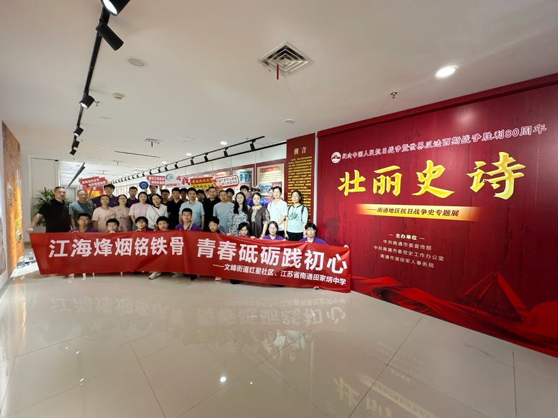 中国江苏网讯 为深切缅怀革命先烈,传承江海大地红色基因,9月28日下午,江苏省南通田家炳中学和文峰街道红星社区,依托“星田计划”家校社协同育人教联体项目,组织师生代表和社区党员代表,赴南通方志馆参观学习“壮丽史诗——南通地区抗日战争史”专题展览。此次活动以“江海烽烟铭铁骨 青春砥砺践初心”为主题,旨在通过本土历史强化理想信念教育。