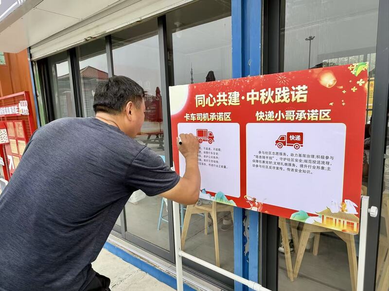 活动尾声,印有“同心共建 中秋践诺”的主题板前,卡车司机们在“主动参与社区服务,传递行业正能量”区域,郑重签下姓名;快递小哥们则在“参与社区志愿,助力基层治理”区域写下承诺,“主动参与社区反诈宣传”“发现安全隐患及时上报”等字样,成为最质朴的约定。社区网格员代表在主题板末端签下“精准对接需求,做好服务保障”的回应承诺,双向约定让共建责任更清晰。承诺签署后,大家还主动分享实际需求,社区工作人员现场回应了“电瓶车充电区增加车棚”等问题,社区工作人员一一记录,确保“每一条需求都有回音”。