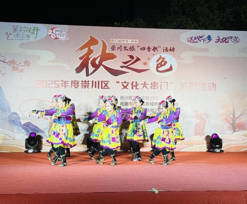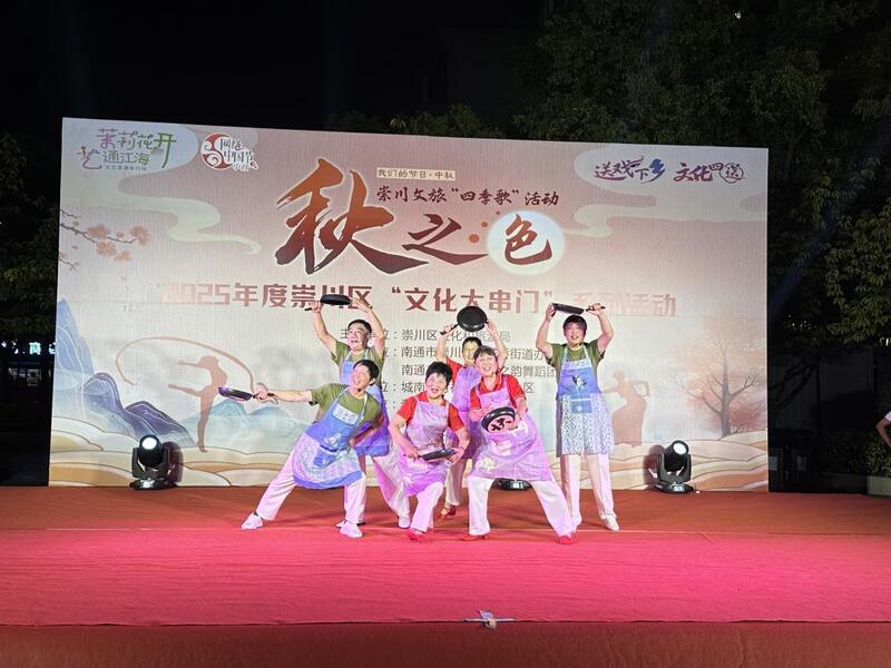 演出尚未开始,广场上早已人头攒动,居民们搬着小板凳,带着孩子在舞台旁早早等候这场家门口、老百姓自己的演出。伴随着欢快的锣鼓声,演出正式拉开序幕。开场舞蹈《红船向未来》激情昂扬,瞬间点燃了现场气氛。随后,蒙古舞《奔腾》仿佛将大家带到一望无垠广袤的草原,方言表演《话说南通古民谣》勾起了观众儿时的记忆,非遗《丰收号子》喊出了丰收的喜悦,说唱《亲家母谈婚事》《锅碗瓢盆话和谐》唱响了文明新风尚……这场由来自11个基层文艺爱好者组成的社会组织,精心编排的一个个节目不输专业水平,让群众提前感受国庆中秋节日喜悦气氛。