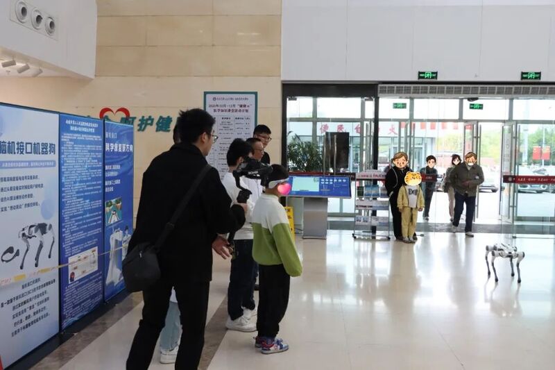 在智慧康复体验区内,一幕未来感十足的康复场景正在上演:一位体验者正通过“意念”让眼前的脑机接口机器狗进行行走、坐立、打招呼等动作,同时旁边的脑机接口上肢康复训练设备正根据另一位体验者的运动意图完成康复训练,而不远处的下肢康复机器人则辅助体验者迈出坚实的步伐——这些先进康复设备共同构筑起南通二院智慧康复的生动一面,让康复训练告别传统模式的局限,迎来精准个性化的新时代。