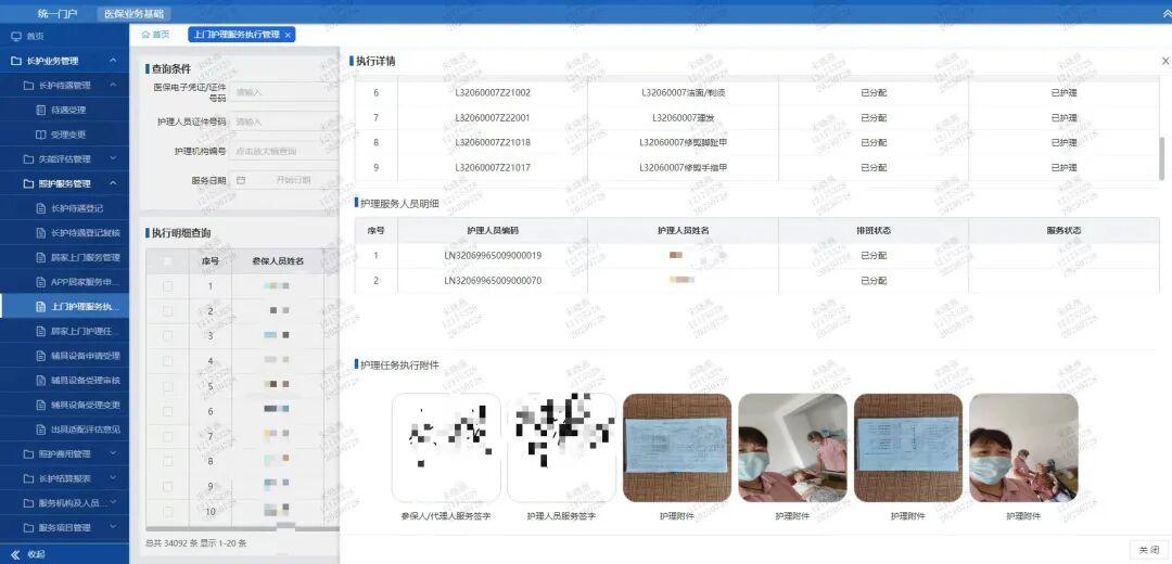 此外,业务模块深度依托省医保信息平台数字化底座,打造长护险数据分析系统,整合业务运行数据、资源配置情况、服务评价结果等核心指标,在可视化界面集中展示全市370余家长期照护保险定点机构、6.2万在享待遇人员的待遇明细与服务动态;针对参保人员和定点机构构建“一人一档”“一户一档”双档案体系,针对长期照护师这一新兴职业工种专项建设信息查询与动态维护模块,实现照护资源精准调度,高效分派重点难点照护任务。同时,依托智能监控子系统、上门护理立体监管体系、支持性辅助器具进销存实时管理等,推动构建全方位、无死角的全链条监管体系。