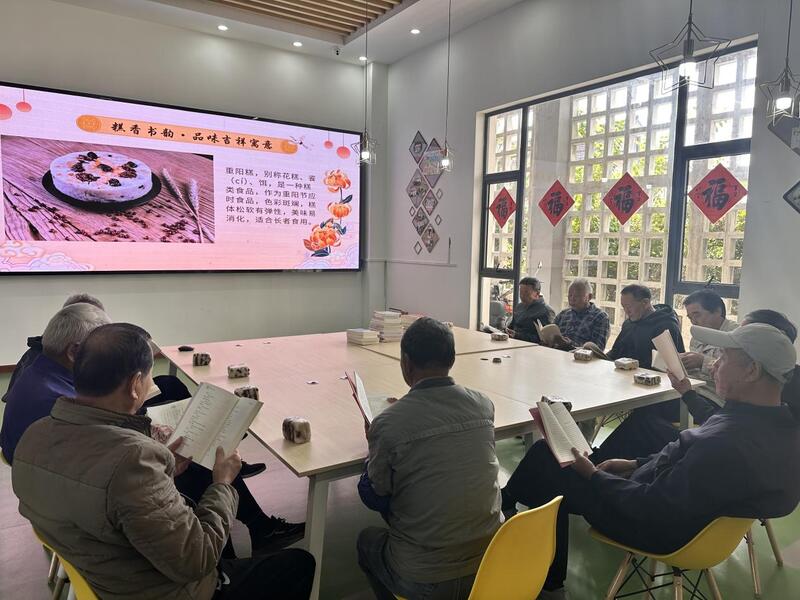 重阳节自然少不了应景美食——重阳糕。志愿者不仅为大家讲解了“糕”与“高”同音,寓意“步步高升”“健康高寿”的美好象征,还分享了重阳糕作为传统节令食品的文化内涵。随后,志愿者为每位老人奉上精心准备的香甜软糯的重阳糕。大家边品尝、边交流、边翻阅手中的书籍,糕香与书香交织弥漫,营造出温暖而浓郁的节日氛围,也映照出重阳佳节所蕴含的团圆与祝福。