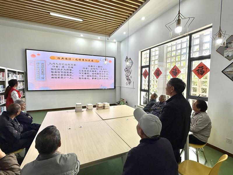 活动伊始,志愿者以生动的讲述,带领大家追溯重阳节的起源与演变,从传说到登高、佩茱萸、饮菊酒等传统习俗,再到“老人节”的现代内涵,让在场每一位对重阳文化有了更深的了解。随后,志愿者为大家讲述了重阳节的传统习俗,并声情并茂地朗诵了《九月九日忆山东兄弟》和《采桑子·重阳》,经典诗词跨越千年,引发深深的情感共鸣。