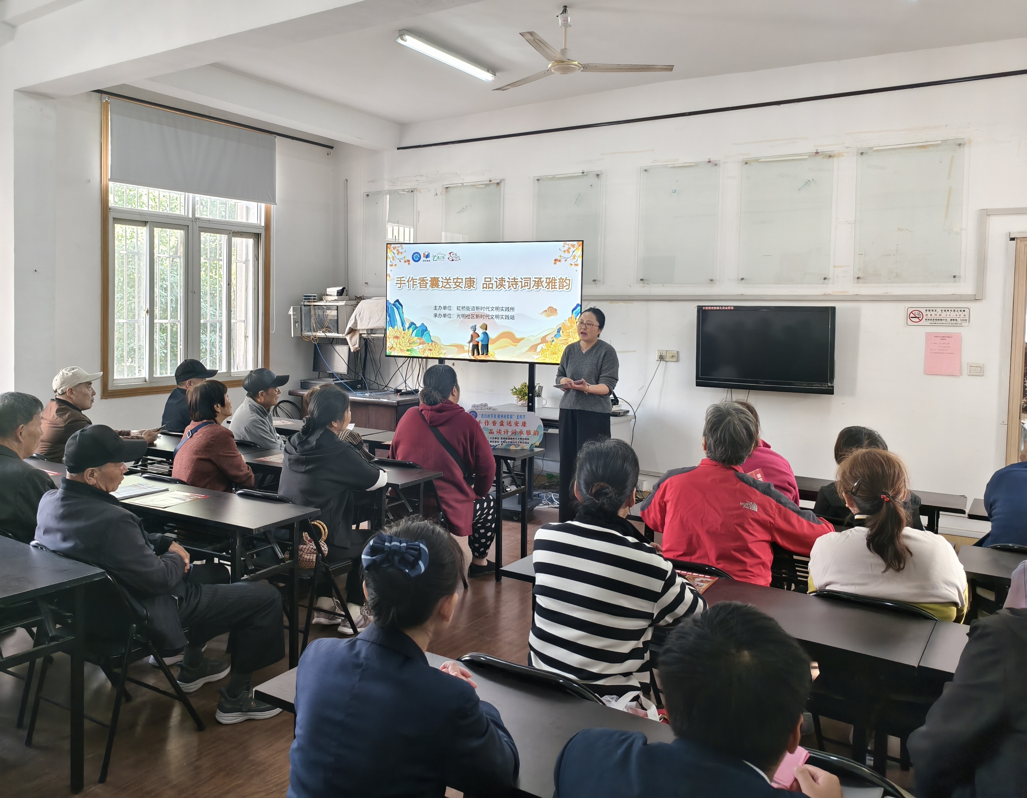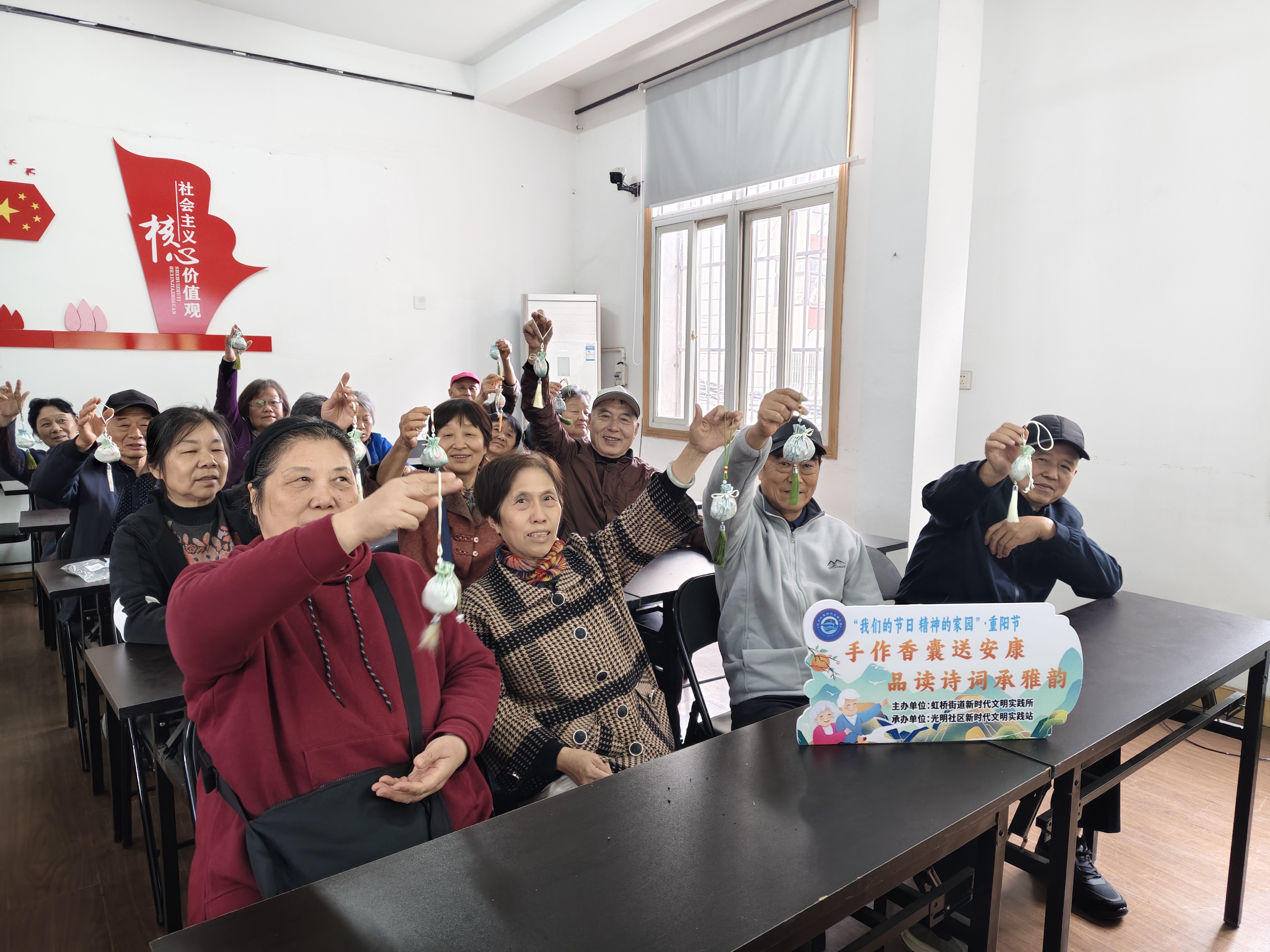 中国江苏网讯 金秋送爽,茱萸飘香。为弘扬尊老、敬老、爱老的传统美德,丰富辖区老年居民的精神文化生活,10月24日下午,虹桥街道光明社区开展“手作香囊送安康 品读诗词承雅韵”我们的节日——重阳节主题活动,本次活动通过品读重阳诗词、茱萸香囊手作、反诈知识宣传等形式,让社区侨眷、邻里居民在欢乐祥和的氛围中度过了一个难忘的节日。