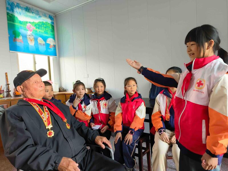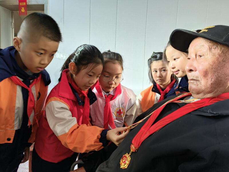 看到刘德和老人胸前的两枚闪闪的勋章,孩子们好奇地围了过来。“爷爷,这枚勋章是怎么来的呀?”“爷爷您当年是不是特别勇敢?”老人笑着回忆:1946年他参军,1948年参加淮海战役,在战斗中身负重伤;他的儿子刘生华,正是杨新明的战友,1982年参军,1985年在南疆战斗中迎着枪林弹雨阻击敌人,壮烈牺牲。摸着沉甸甸的勋章,感受着先辈奋斗的荣光,孩子们仿佛触摸到了那段热血岁月,轻声说:“爷爷和叔叔都是大英雄!”