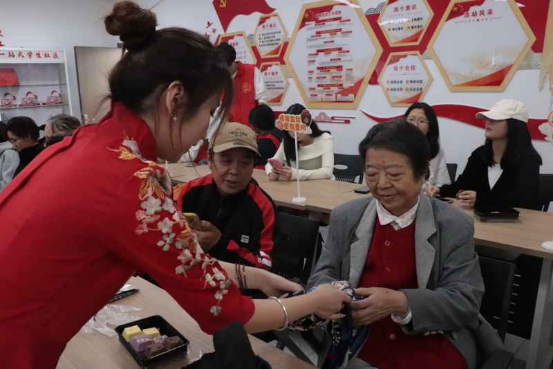 在温馨的“丝巾礼仪,温暖陪伴”环节,礼仪社的学生们针对老年人不同生活场景,传授各种丝巾系法。老教师们兴趣盎然,跟着学生认真学习,彼此交流心得。五彩的丝巾在他们颈间飘动,映衬着喜悦的笑容,现场一片其乐融融。