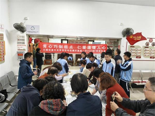 重阳节前夕,中央商务区社区民政、关工委、团委等群团条线与南通一中2025级1班团支部携手开展了“青心巧制糕点 仁爱温暖人心”活动。活动当天,专业糕点师傅现场指导,从糕点制作步骤、面团揉制技巧到馅料搭配要点,都讲解得细致入微。青少年与老人们一起动手,从揉面、擀皮到包馅、塑形,共同完成重阳糕的制作。老人们脸上洋溢着幸福笑容,同学们也在制作过程中感受到了传统节日的文化魅力。活动结束后,大家将重阳糕送到辖区高龄老人家中,送去了重阳的关怀。此次校社共建活动,拉近了青少年与老年人的距离,营造了“老少同乐、邻里和睦”的良好氛围。