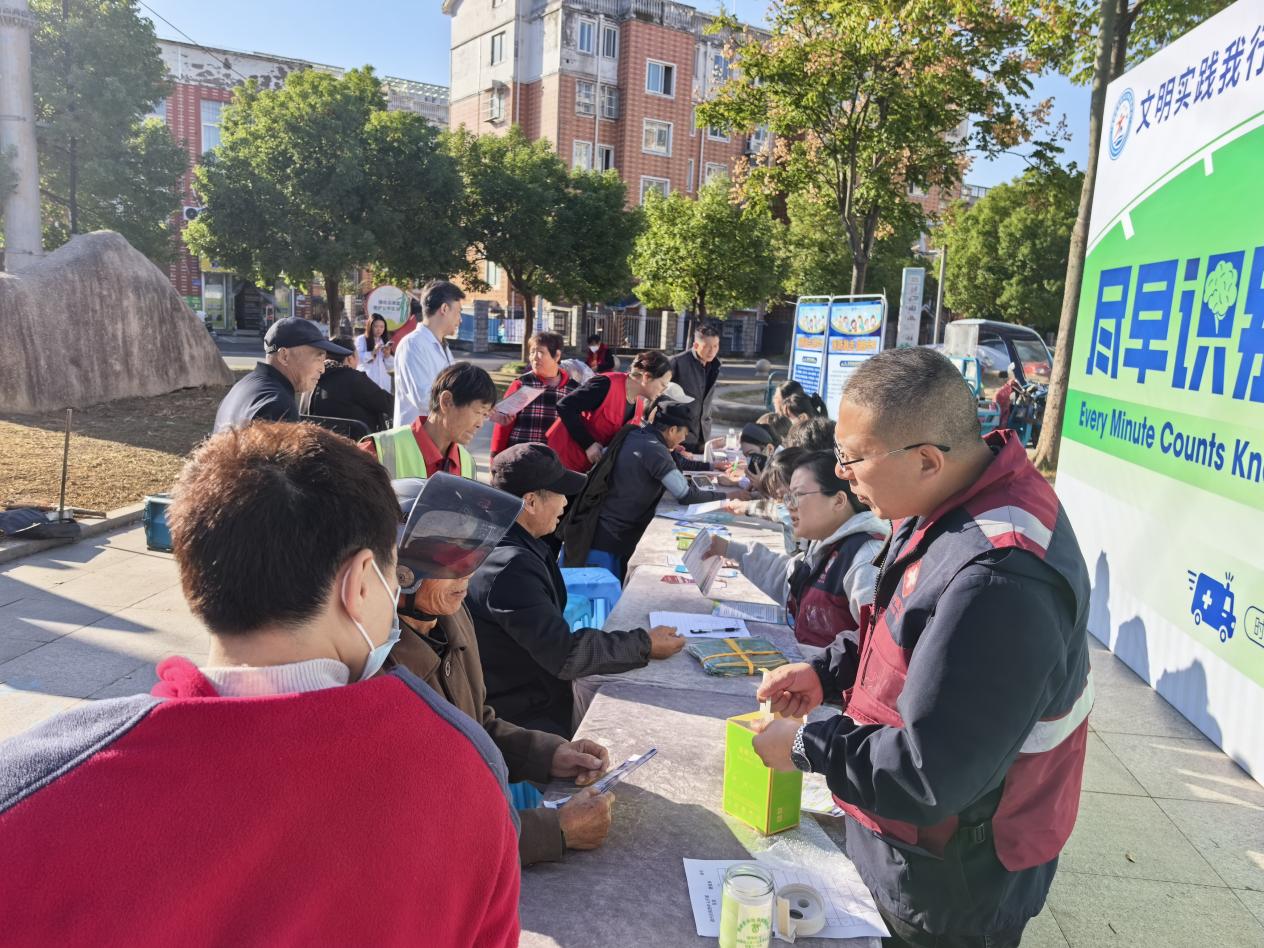 “大妈您的血压有点偏高,平时要注意低盐饮食,记得按时吃药。”“血糖控制得不错,继续保持规律作息。”医护人员一边检查,一边为每位居民定制“健康提醒”。广场另一侧的服务桌前,医护人员正忙着为居民测血压、测血糖,志愿者则在一旁协助登记信息、维持秩序。针对老年居民行动不便的特点,医护团队还准备了“应急联系卡”,上面印有卫生院的急救电话和卒中快速识别口诀,方便居民随时取用。“我们平时去医院检查要跑老远,今天在家门口就能测血糖、听讲座,真的太贴心了!”刚测完血糖的张大爷笑着说。