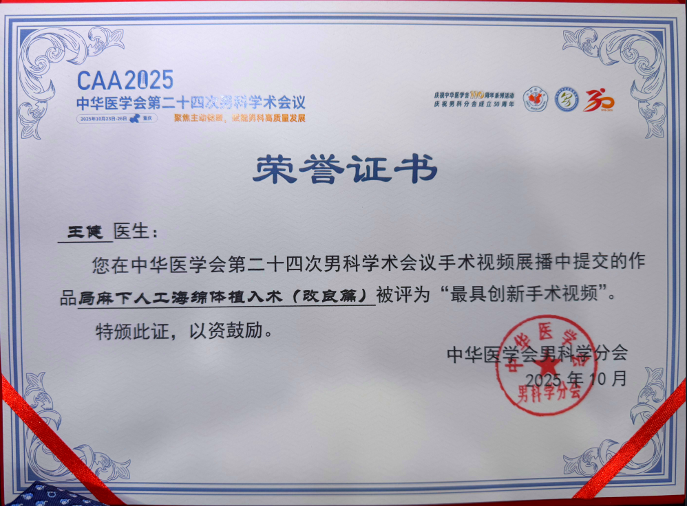 与此同时,王健凭借在男科学领域的深厚造诣和突出贡献,荣膺该专家协作组顾问专家,未来将积极参与制定行业标准、撰写专家共识、推广先进技术,为推动我国人工海绵体植入手术的规范化、标准化和精准化发展贡献力量。