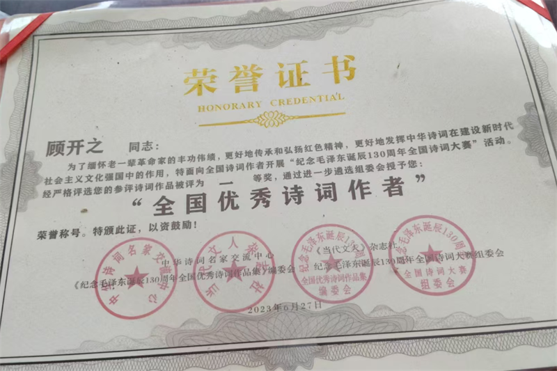 顾老平生酷爱梅花,笔名“驿梅”。他如梅花般刚毅,拥有高尚人格魅力。在祖国文艺百花园中,他就像一朵芬芳吐艳的梅花,散发着独特魅力。正是有许许多多像顾老这样的人,中华民族文艺才能百花齐放。顾开之先生用一生诠释着对诗词的热爱,他的故事,激励着更多人投身于文学艺术创作,为传承和弘扬中华优秀传统文化贡献力量。(陈志国)
