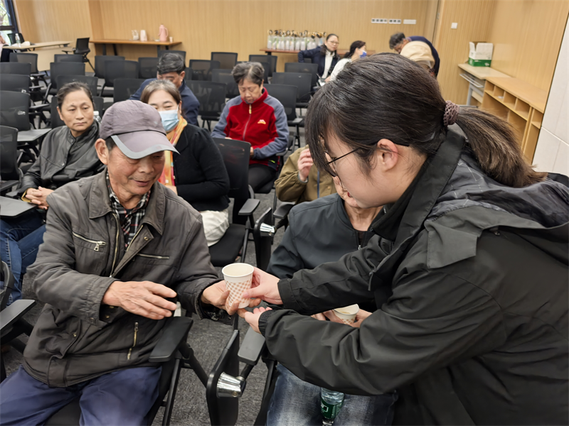 随后进入轻松温馨的茶饮环节。活动为老人们不仅准备了暖心礼包,还现场泡煮了秋冬养生茶,大家围坐一堂,在氤氲茶香中畅谈交流。一杯杯温热的金银花枸杞茶,不仅滋润了喉咙,更传递出“药食同源”的文化智慧。饮茶之余,传统养生理念随香入心,成为活动中一段自然融汇的插曲。义诊区同样温情洋溢。志愿者耐心为老人测量血压,提供健康咨询,将“仁心仁术”的中医精神化为具体行动,让长者们感受到社区浓浓的关怀。