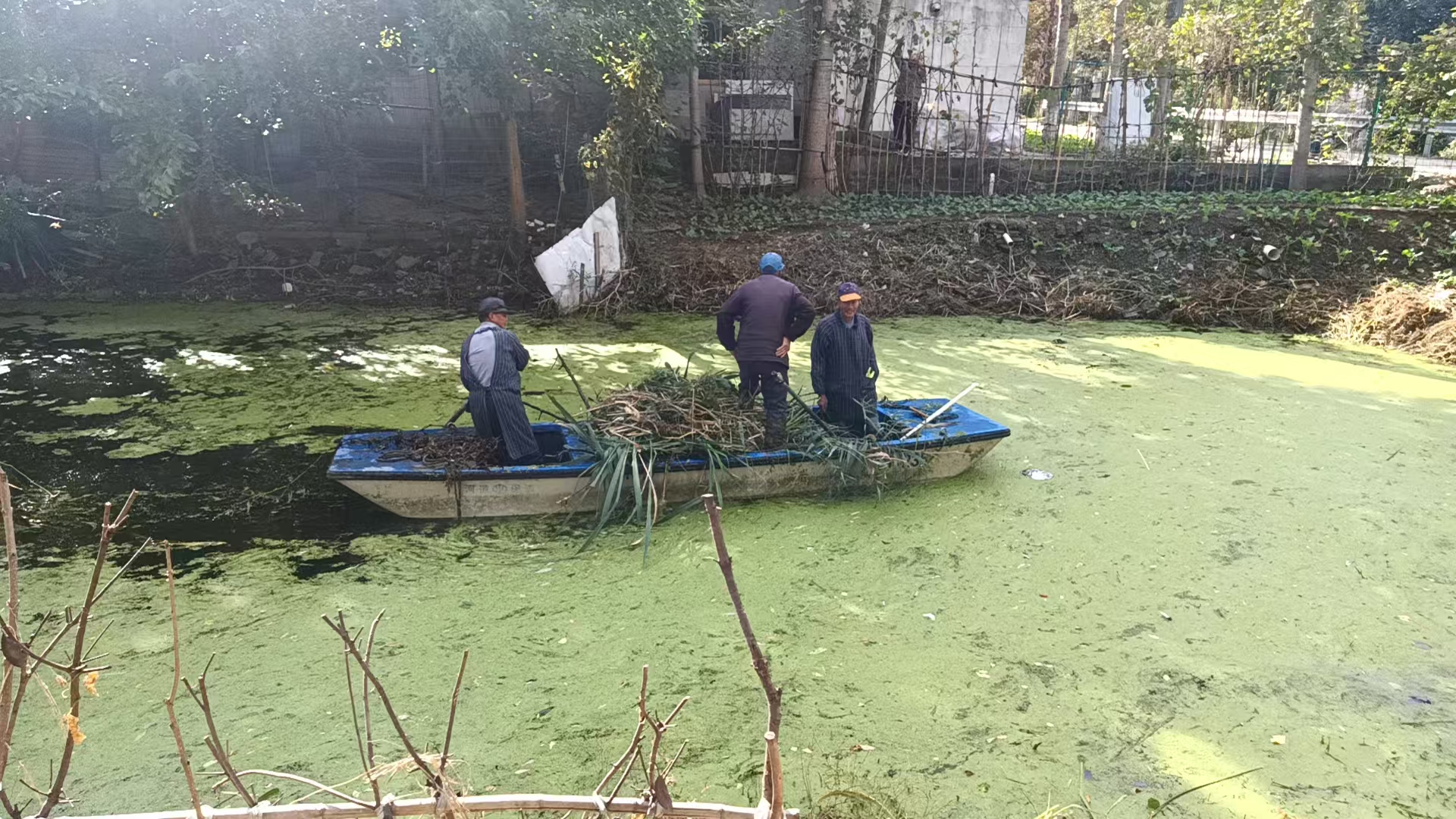 以水为脉护生态,以行践诺守初心。在党建引领下,机场新村保洁队迅速组建“河道清障先锋队”,聚焦河道漂浮物、沿岸垃圾等突出问题,开展“地毯式”清理攻坚。保洁队乘着船,手持长杆打捞网,在长约100米蜿蜒河道中稳步推进,对白色垃圾、废弃杂物、枯枝败叶等进行全面清捞。大家齐声喊着号子合力拖拽,“一、二、使劲!”清脆的号子声在河道上空回荡。阳光映照下,清澈的河水泛起粼粼波光,曾经杂乱的河道逐渐恢复整洁通畅,沿岸绿植相映成趣,一幅“河畅、水清、岸绿”的生态画卷徐徐展开,赢得居民群众一致好评。