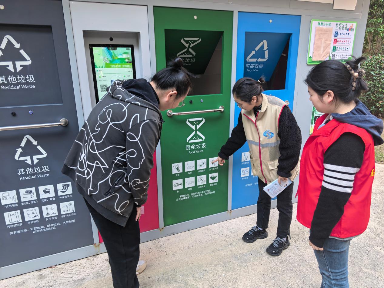 在和盛林荫水岸小区垃圾分类亭旁,党员志愿者们搭建起“流动宣传站”,围绕居民日常垃圾分类的“易错点”开展精准宣讲。志愿者手持分类指南手册,结合亭内的可回收物、厨余垃圾等分类容器,现场演示实操方法。针对居民提出的“废旧电池归哪类”“外卖餐盒怎么分”等问题,逐一耐心解答。志愿者还引导前来投放垃圾的居民“当场练手”,手把手纠正分类偏差,推动“垃圾分类从‘要我做’到‘我要做’”的理念深入人心,为小区营造整洁有序的环境打下坚实基础。