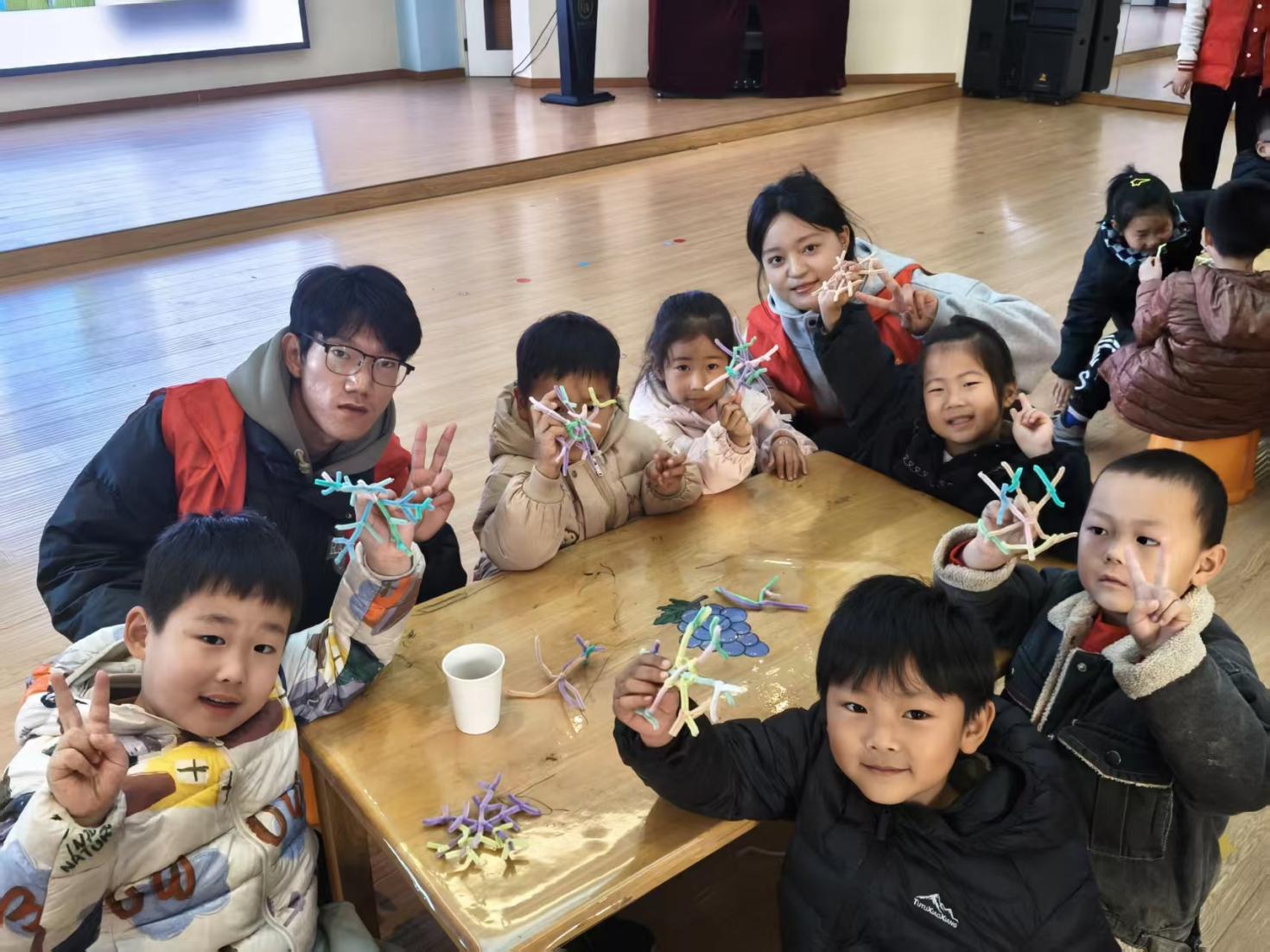 话剧落幕,志愿者们分组围坐、俯身示范,耐心指导孩子们运用缠绕、弯折等基础技巧,将彩色扭扭棒变成片片晶莹的雪花。孩子们尽情发挥创意,形态各异的雪花在孩子们掌心绽放。有的规整对称,有的恣意伸展,每片都承载着独特的想象力。孩子们用一片片独一无二的雪花,体验着动手实践的快乐与成就感。