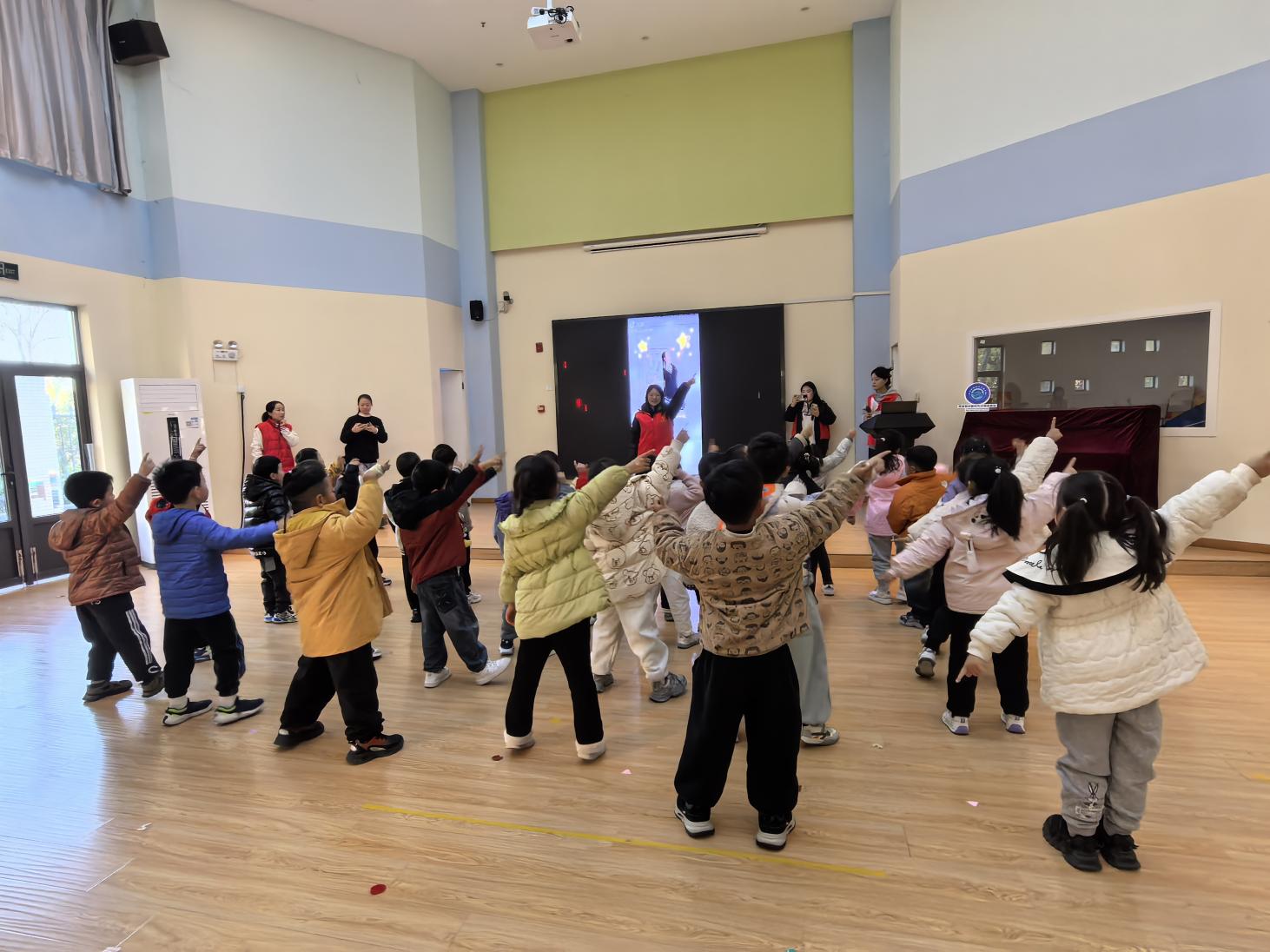 《雪宝宝》欢快的旋律伴着冬日暖阳适时响起,志愿者们化身快乐的领航员,站在孩子们面前,用夸张又可爱的动作示范着,每一个笑容都洋溢着感染力。孩子们挺直小身板随着音乐舞动,他们稚嫩的歌声清亮又治愈,稚拙的舞步可爱又纯粹,温暖着在场的每一个人。