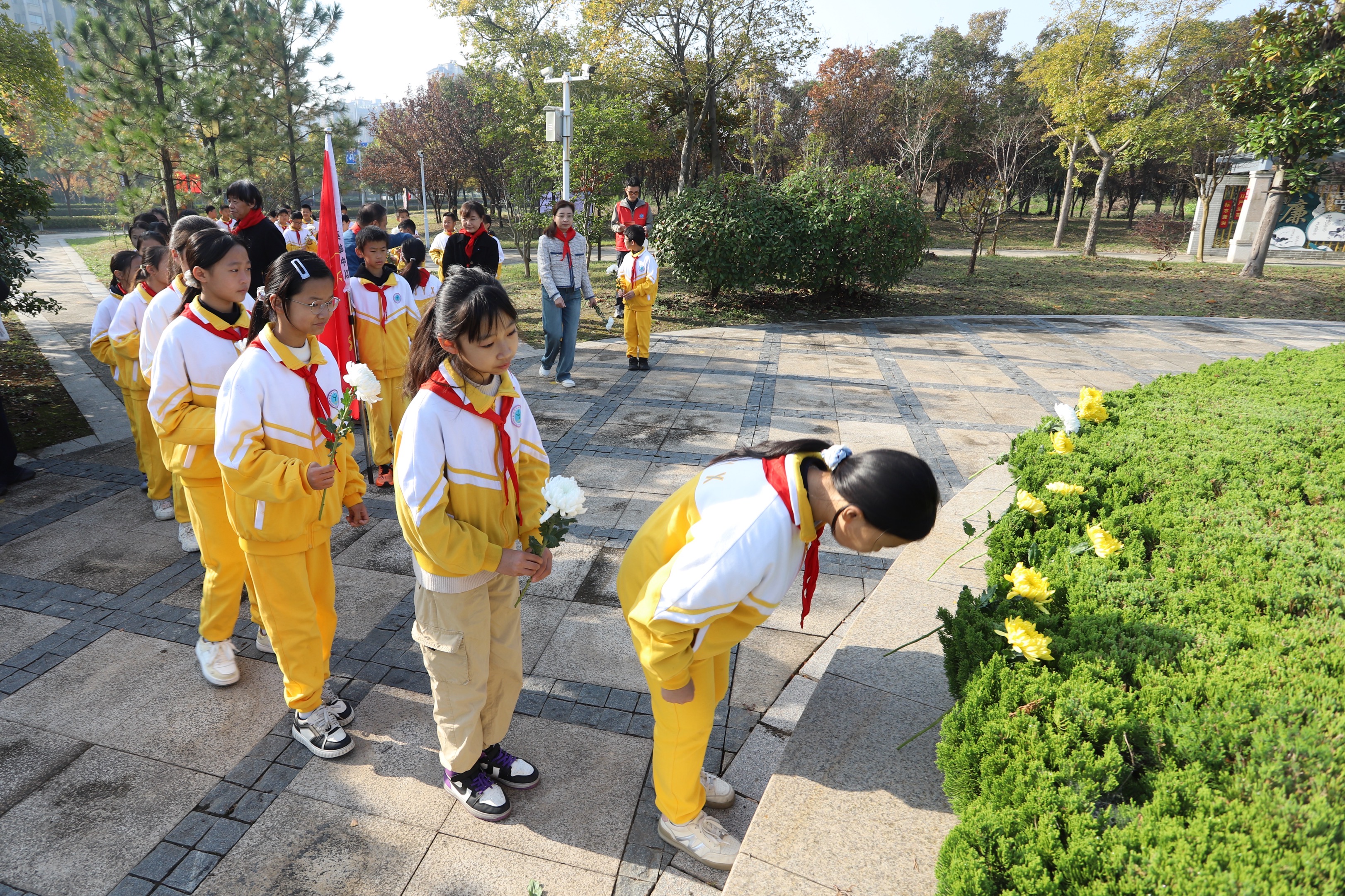 在队旗交接环节,副校长朱峰将象征荣誉与责任的队旗郑重交到新一任中队长洪展博手中。“现在你接过的不仅是一面旗帜,更是一份沉甸甸的责任。”朱峰的嘱托在纪念园回荡,“希望你当好‘火车头’,带领队员们树立信心、严于律己,把英雄中队的旗帜举得更高!”随后,朱峰为顾臣贤烈士孙子顾伟颁发校外辅导员聘书,延续英模血脉与少先队教育的深刻联结。仪式最后,全体人员手持菊花,有序走到烈士铜像前,依次将菊花轻轻放在铜像下,每一朵菊花都承载着对先烈的深切缅怀与无尽敬仰。