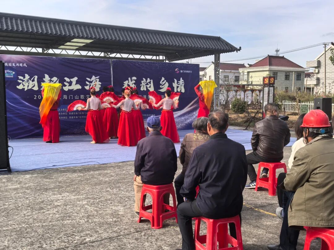 随着演出拉开帷幕,精彩节目轮番登场。演员们身着精美戏服,用婉转的唱腔、生动的表演,将海门山歌等特色戏曲的魅力展现得淋漓尽致。舞蹈表演中,演员们挥舞着色彩艳丽的绸带,身姿轻盈灵动,瞬间点燃了现场氛围,赢得观众阵阵掌声;独唱节目里,歌手以富有感染力的歌声,传递出深厚的情感,让村民们沉浸其中。