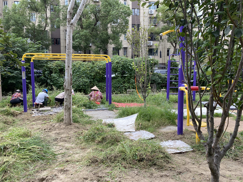 新建路新村南区建成至今已有20余年历史。小区内的健身器材区域是为满足居民健身需求增设的,起初周边错落有致的绿化带为小区增添了不少生机,成为居民休闲锻炼的好去处。但随着时间推移,受养护经费有限、日常管理人手不足等因素影响,这片绿化带逐渐沦为“老大难”区域——杂草疯长过膝,不仅遮挡视线,还容易缠绕健身器材;落叶、枯枝常年堆积在器材旁,雨天后地面泥泞不堪,行人稍不注意就会滑倒;到了夏天,杂草丛更是蚊虫滋生的“温床”,居民想靠近健身都得“鼓足勇气”。