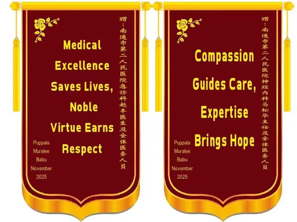 康复良好的Mr.Puppala出院后又联系上南通二院急诊科副主任赵丰和神经内科主任马松华,表示要参照中国人向医护人员表达谢意的方式,也给他们制作锦旗送来,并且迫不及待地发来他精心设计的全英文锦旗图稿,分别写着“Medical Excellence Saves Lives, Noble Virtue Earns Respect.”(卓越医术挽救生命,高尚品德赢得尊重)和“Compassion Guides Care, Expertise Brings Hope.”(仁心引领救治,专业带来希望)。