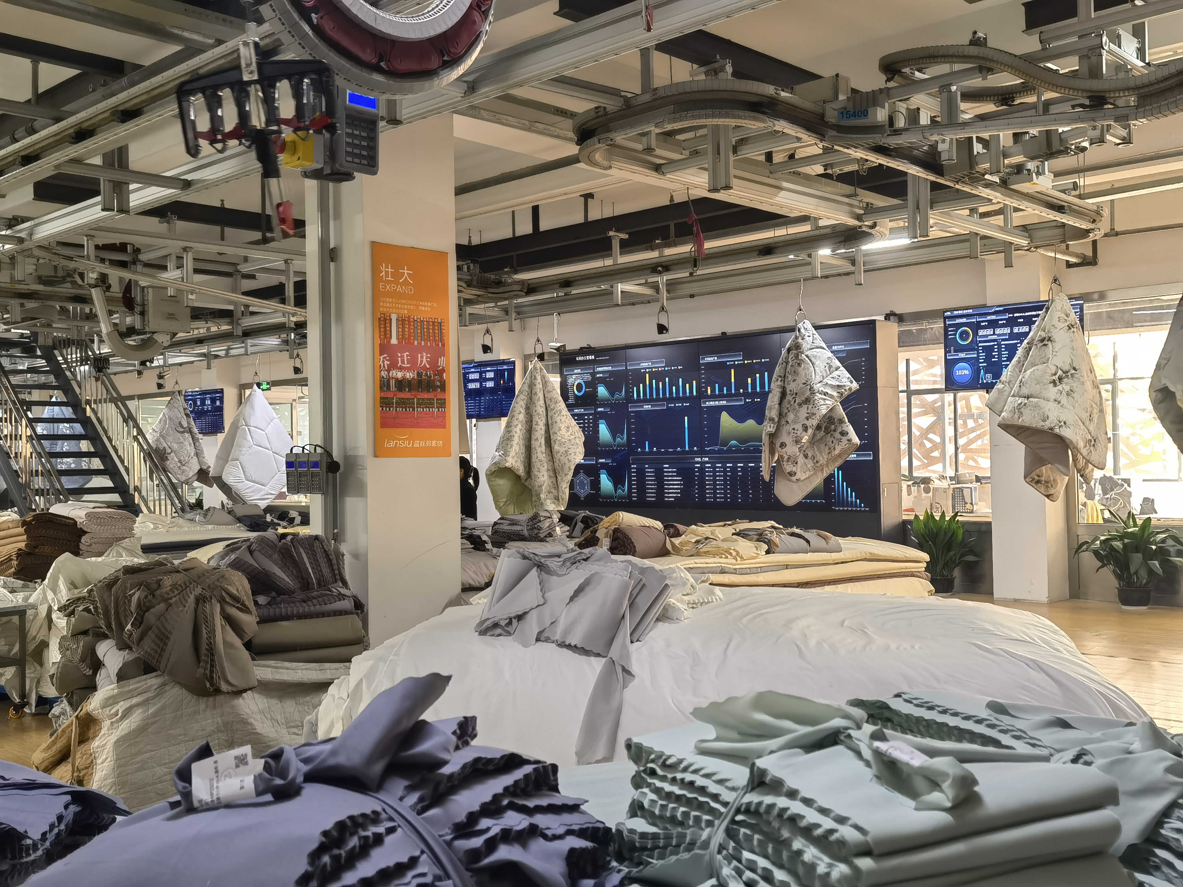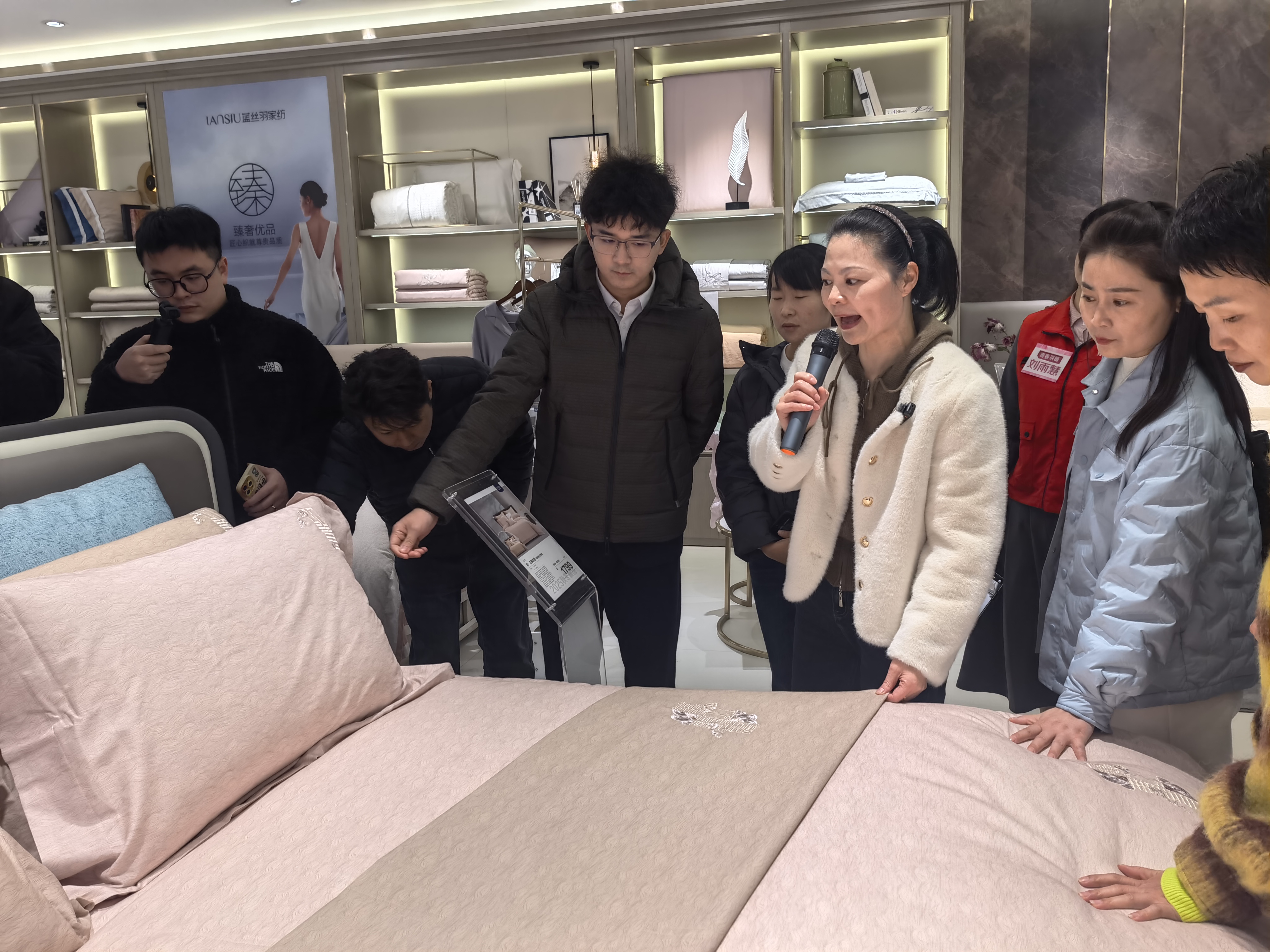 25日上午,采风团来到“中国家纺名镇”通州川姜镇,探三威家纺工作室,看如何用算法生成花型;访蓝丝羽智能车间、老裁缝家纺生产基地,见证全自动生产线的“黑科技”,大家无不惊叹于这里家纺产业的硬核实力与创新动能。经过多年的发展,川姜镇已经成为全国最大的家纺产业集聚区和全球最大的家纺生产基地。现拥有工业园区15个,集聚各类经营主体27000余家。拥有外贸企业300余家,家纺商户4000余家,研发设计单位200余家,水星、金太阳、蓝丝羽等8个中国驰名商标。2024年实现家纺市场贸易额1350亿元,其中电商贸易额约600亿元。