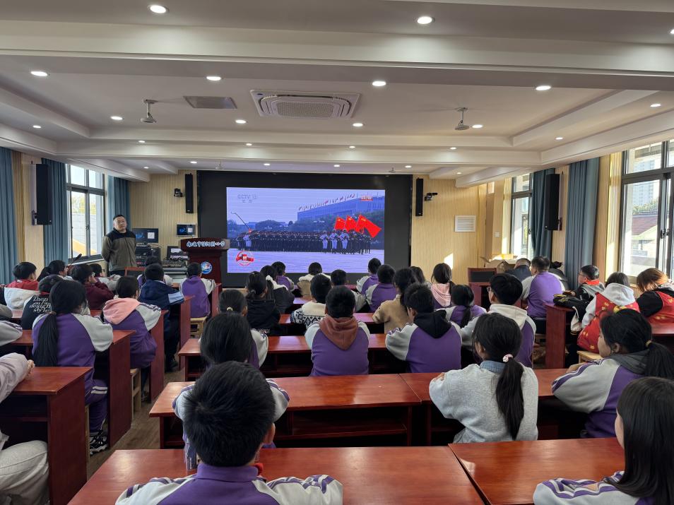 紧接着,现场播放的“9.3大阅兵”纪实影像,将活动氛围推向高潮。受阅部队整齐划一的步伐、现代化武器装备的集中展示,生动展现了新时代中国军队的强军风貌与国家实力的整体跃升。不仅增强了青少年的民族自豪感,也使他们在震撼与感动中,进一步认识到强国必须强军,军强才能国安的深刻道理。来自六二班的王嘉怡同学激动地说:“那些英雄的故事和阅兵方阵连在了一起,让我明白了什么是精神的传承,什么是‘有我在、请放心’的担当!”