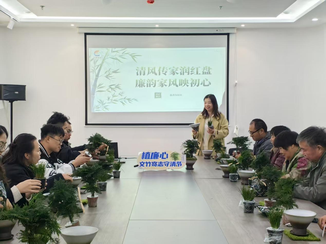 廉洁盆栽DIY现场暖意融融,社区为党员们准备了寓意“清雅高洁、坚韧不拔”的文竹苗、素色陶盆、营养土及刻有“廉”“洁”“正”等字样的定制标签。党员们一边栽种绿植,一边畅谈对廉洁家风的理解与感悟,亲手填土、栽种、扶正的每一个动作,都饱含对廉洁初心的坚守。栽种完毕后,大家纷纷在“廉洁承诺卡”上写下从书中汲取的感悟或家风承诺,一同挂于盆栽上,让每一盆文竹都成为承载家风温度、警醒自我言行的“廉洁符”。