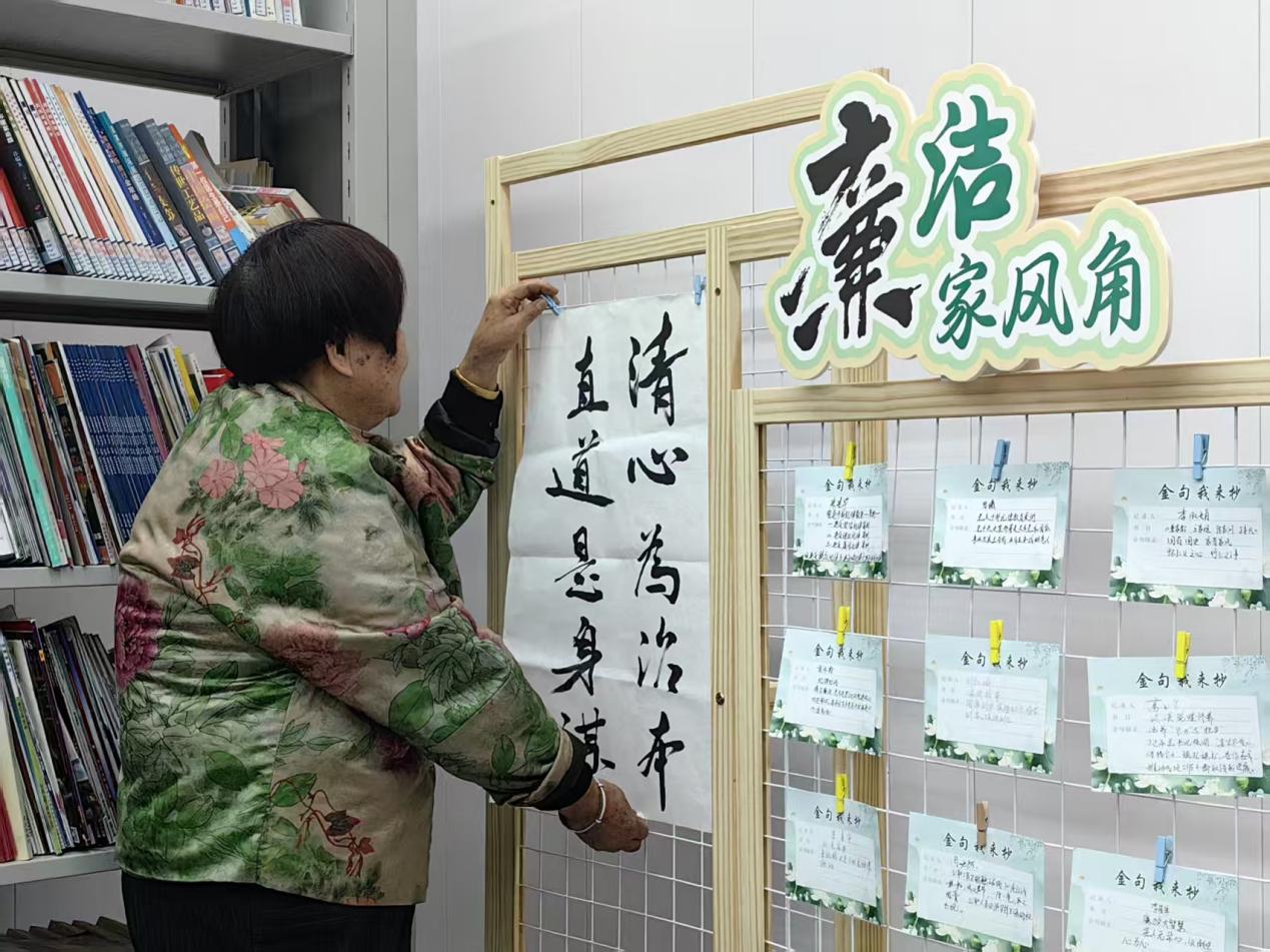 在社区书屋的读书分享与书法写廉环节,党员们结合阅读体验,深入分享廉洁读本中的深刻启示,并围绕“如何以书香涵养家风、以家风守护廉洁”展开热烈探讨。随后,大家挥毫泼墨,将“清正廉洁”“初心如磐”等廉洁经典语句化为一幅幅书画作品,并将这些作品与精选廉洁书籍一同陈列于社区廉洁家风角,标注作者姓名及阅读感悟,打造集阅读、观赏、教育于一体的廉洁文化空间,让书香与廉韵在社区长久萦绕。
