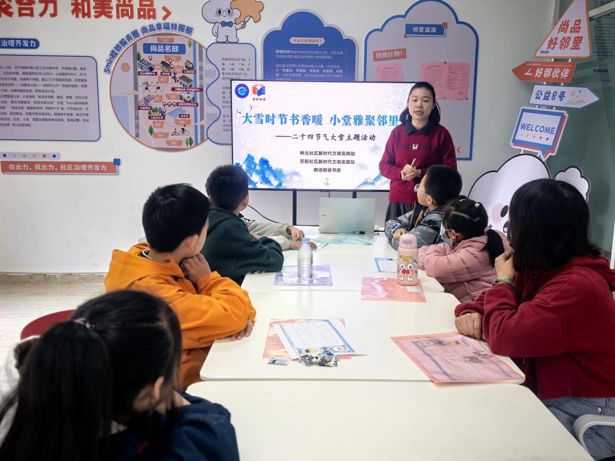 中国江苏网讯 冬意渐浓,二十四节气中的“大雪”如期而至。为了让辖区青少年了解传统文化、感知节气之美,桥北社区新时代文明实践站联合苏阳社区新时代文明实践站开展“大雪时节书香暖 小堂雅聚邻里亲”活动,以二十四节气科普、绘本共读、手工创作等多样的形式,让孩子们在书香与欢乐中,解锁大雪节气的文化密码,感受邻里相聚的温情。
