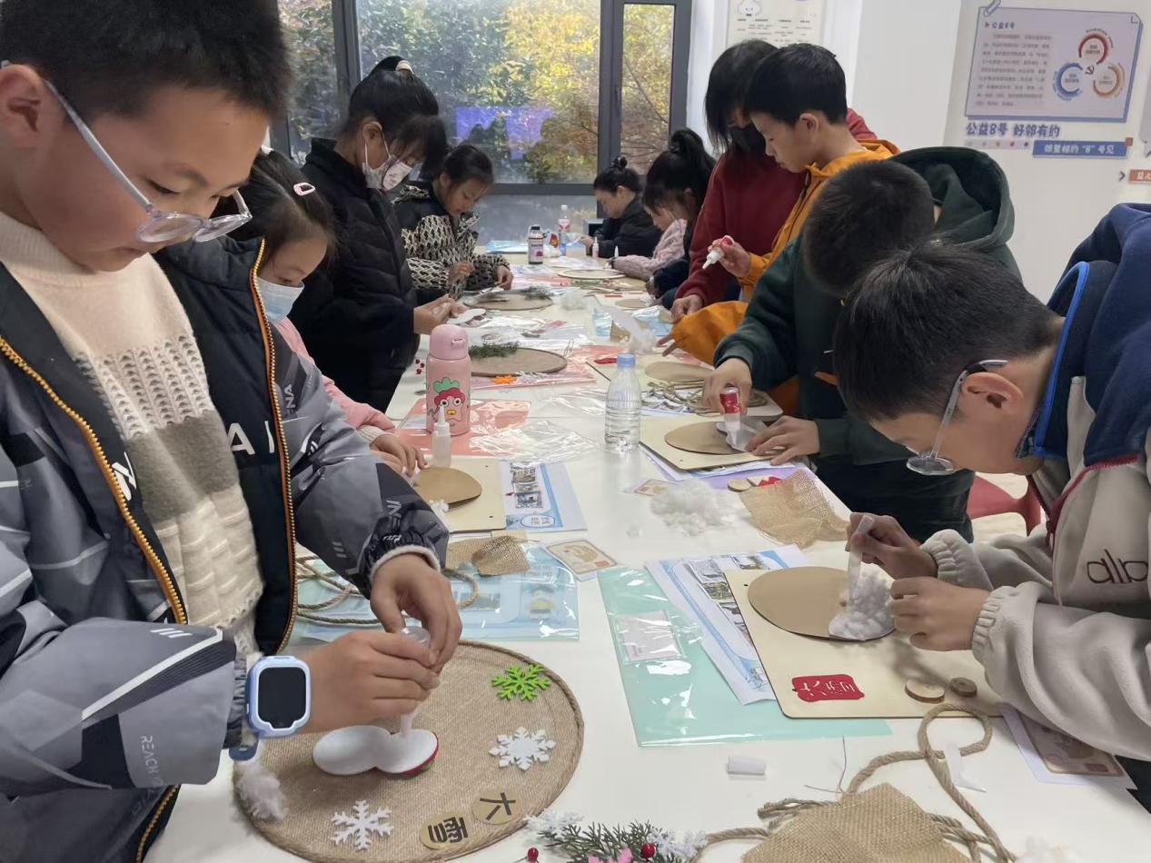 “大家可以用手上的道具,发散想象力,打造属于你的冬日小景哦!”志愿者为大家准备了竹盘、棉花、干枯树枝、迷你雪人摆件等材料,邀请孩子们以“我心中的大雪”为主题,创作一幅独一无二的竹盘造景画。孩子们一拿到材料,便迫不及待地行动起来。他们小心翼翼地将棉花粘在竹盘上,铺出层层叠叠的“雪景”;认真挑选长短不一的树枝,插在“雪地”边缘,勾勒出冬日草木的疏朗姿态。孩子们充分发挥想象力,有的打造了“雪后森林”,有的还原了“邻里堆雪人”,还有的加入了自己喜欢的小装饰,打造了独特的“冬日小屋”。孩子们相互交流技巧,互帮互助,邻里情谊在活动中悄然升温。一幅幅作品都承载着孩子们对大雪节气的理解与热爱,也巩固了活动中所学的节气知识。