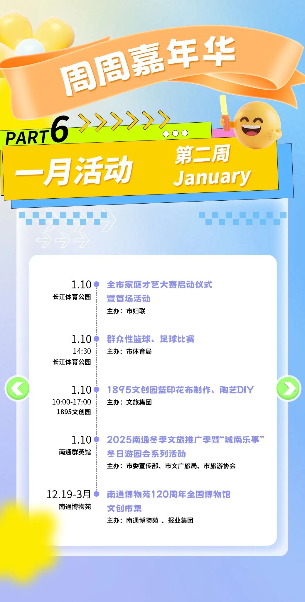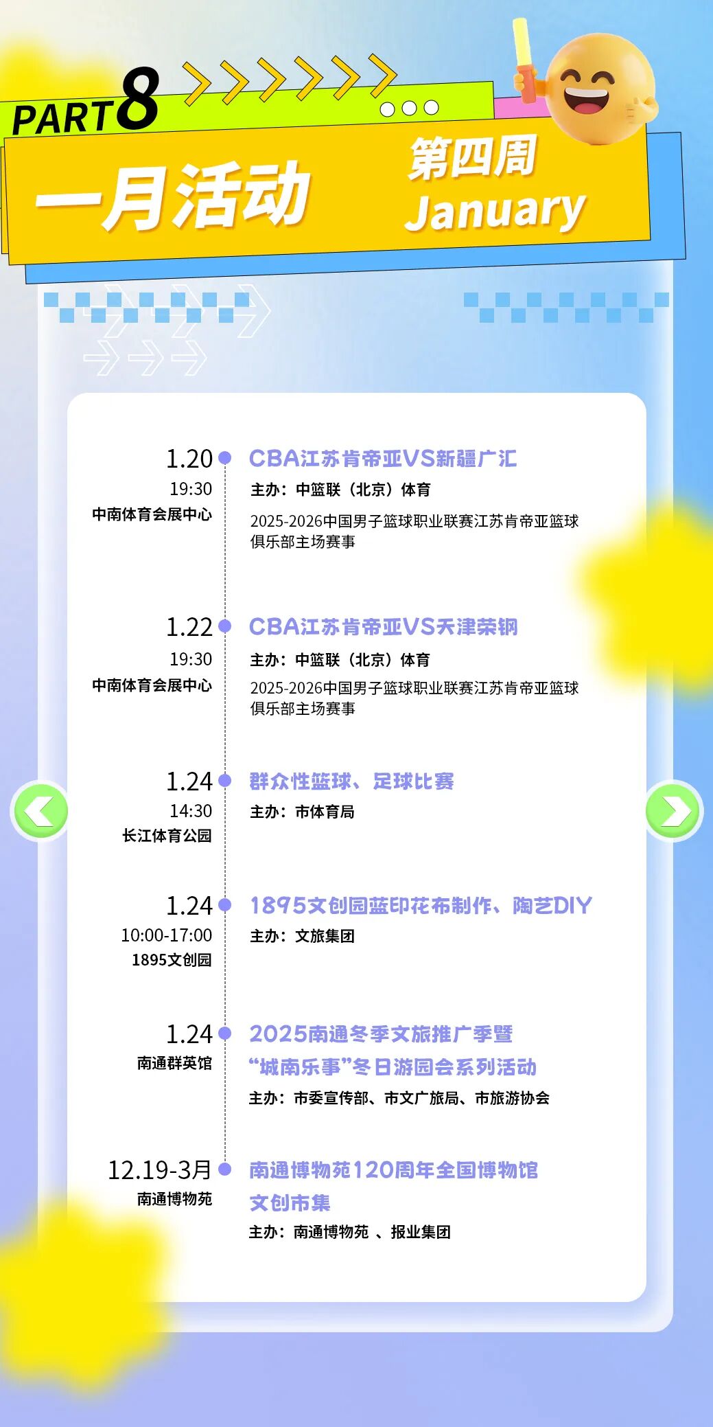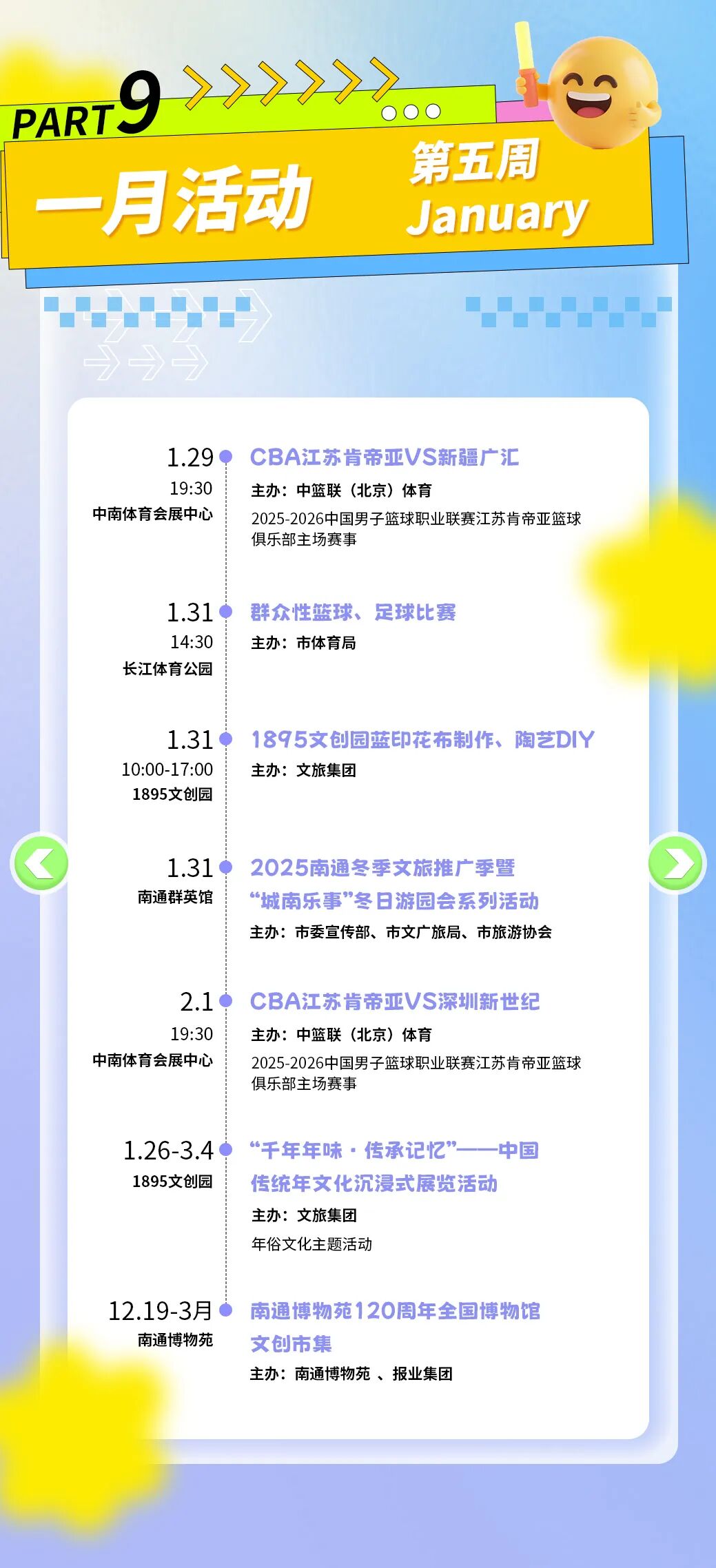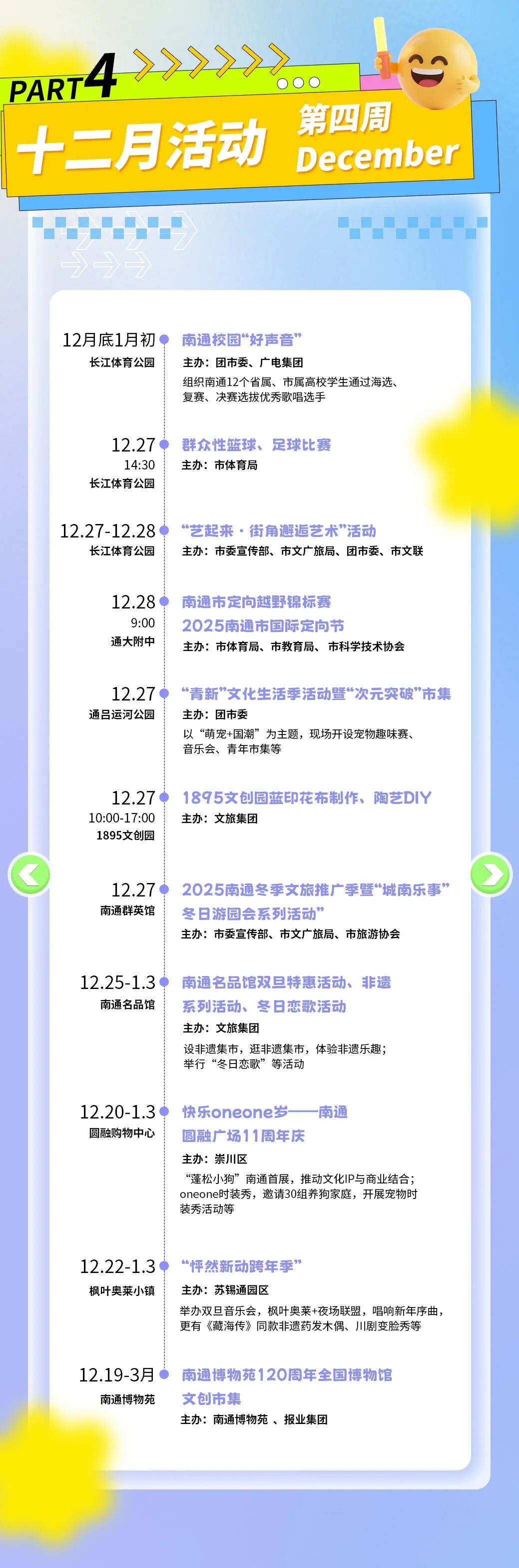 本次消费季以“一周一主题”的形式,将在长江体育公园及各大商圈街区,连续推出赛事潮玩、演艺狂欢、亲子家庭、萌宠国潮、艺韵文旅、汽车好房惠购等不同主题的周末嘉年华。其间,全国体操冠军赛、CBA肯帝亚南通主场比赛、各类市集与文艺展览等活动将轮番登场,为市民和游客提供丰富多样的消费体验。
