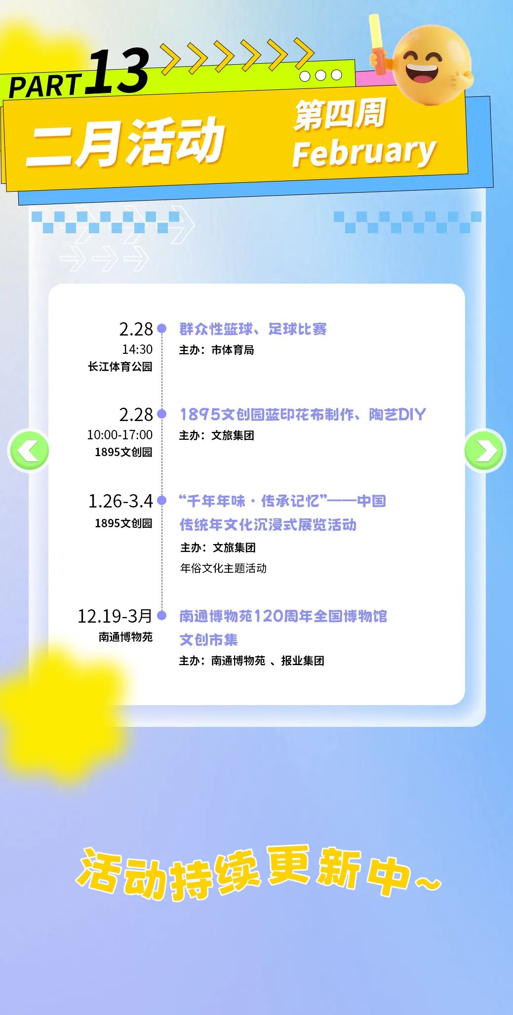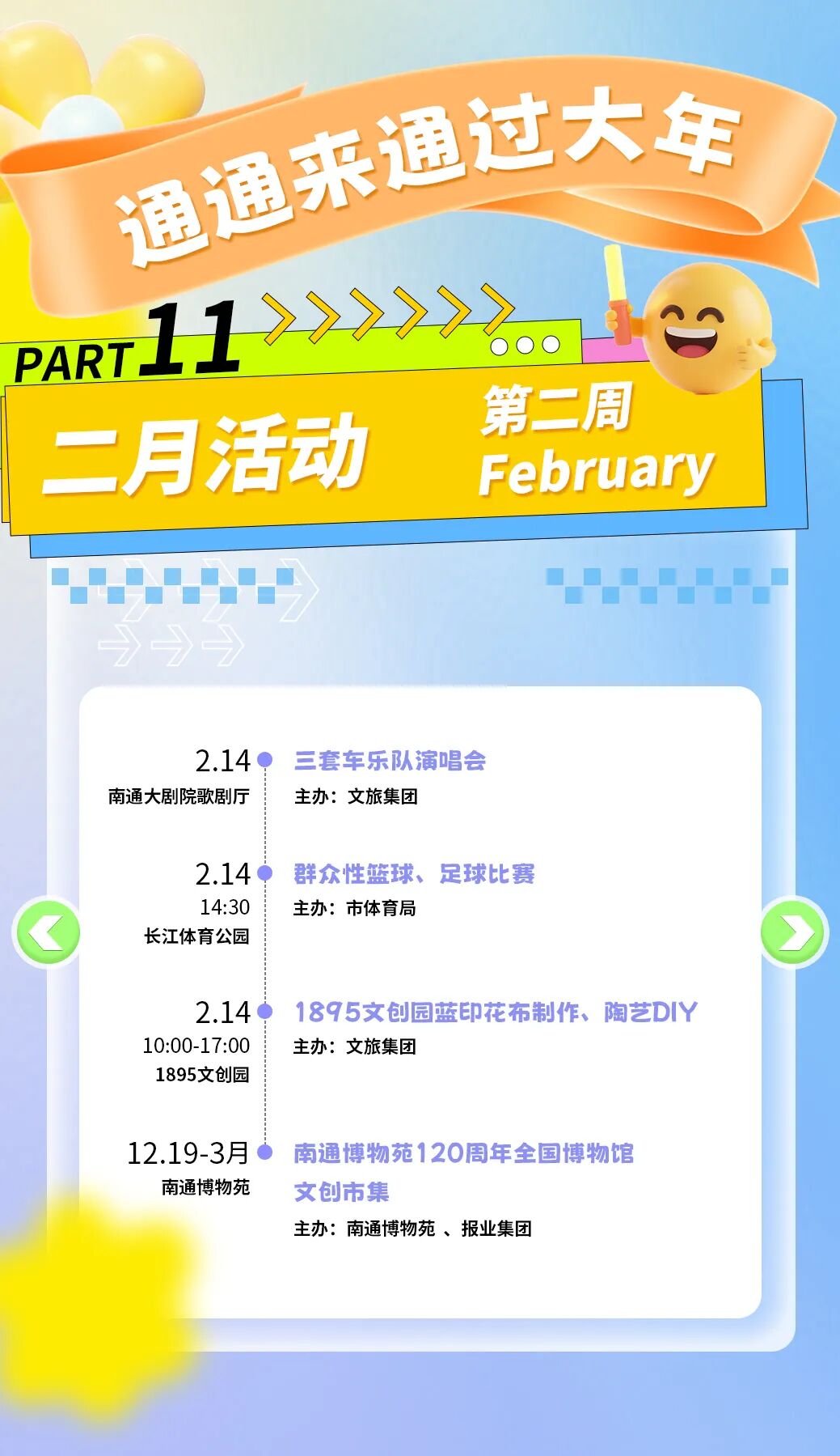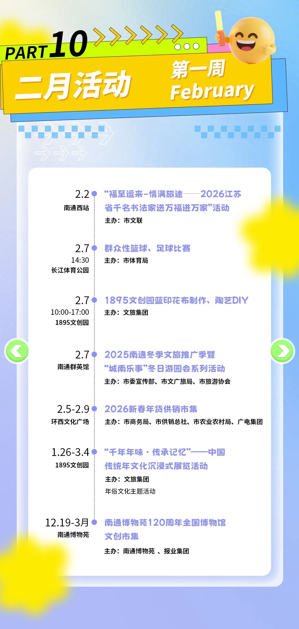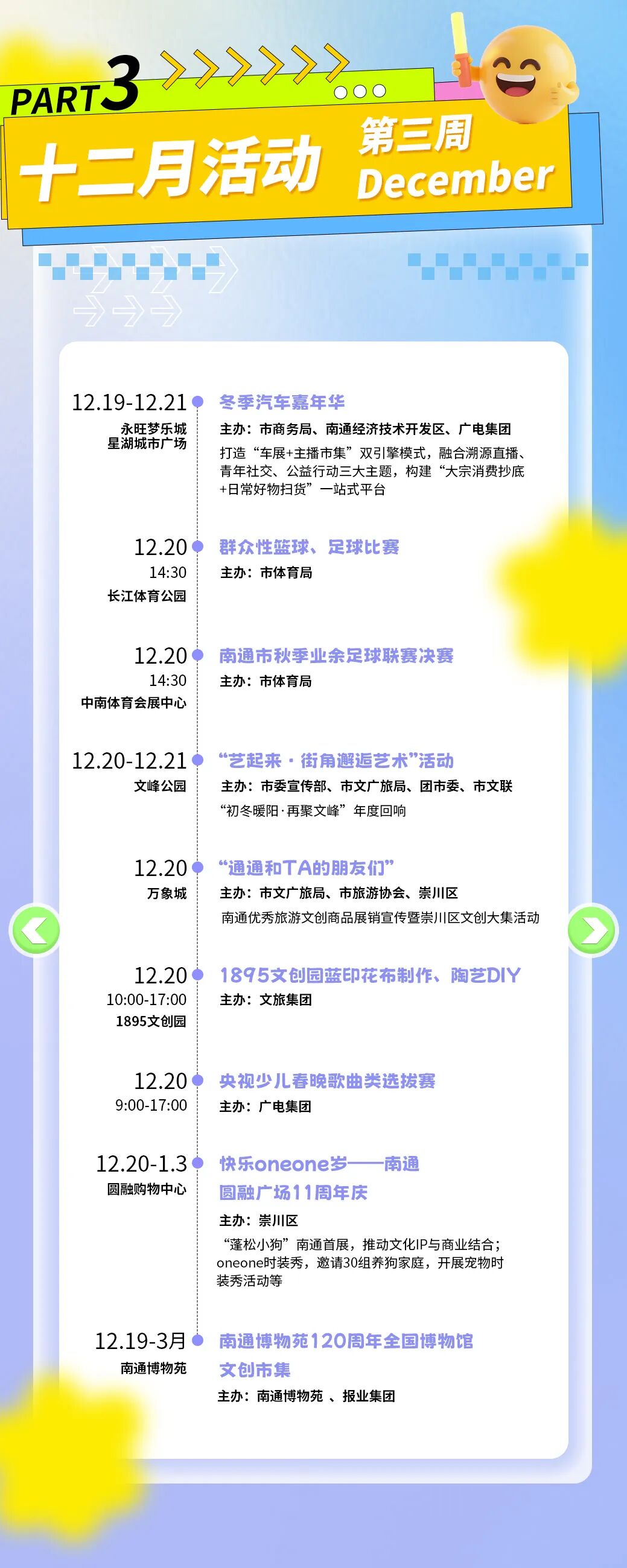 本次消费季以“一周一主题”的形式,将在长江体育公园及各大商圈街区,连续推出赛事潮玩、演艺狂欢、亲子家庭、萌宠国潮、艺韵文旅、汽车好房惠购等不同主题的周末嘉年华。其间,全国体操冠军赛、CBA肯帝亚南通主场比赛、各类市集与文艺展览等活动将轮番登场,为市民和游客提供丰富多样的消费体验。