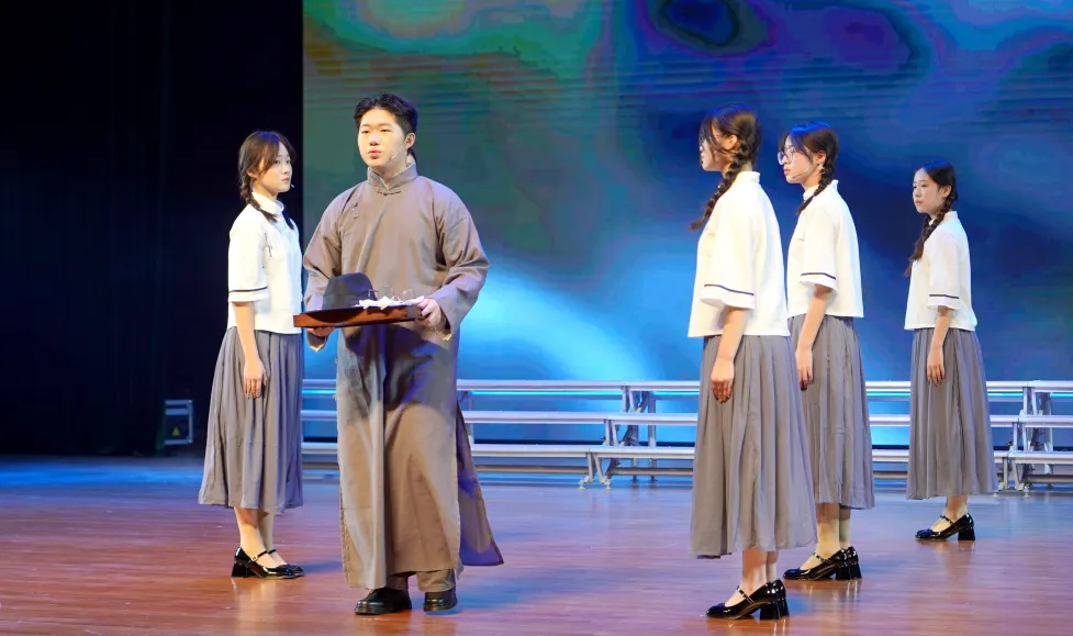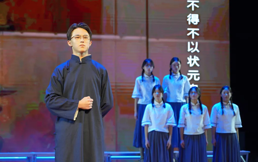 “再遇·感怀”篇章中,南通艺术剧院携手学校戏剧表演社团,带来纪实话剧《张謇传》节选。演员们凭借精湛的演技和细腻的表演,生动还原张謇的传奇片段,让观众仿佛与先贤进行了一场精神对话,深刻感受到了张謇精神的魅力。这不仅是一场视听盛宴,更体现了学校挖掘本土资源、创新思政教育的努力。