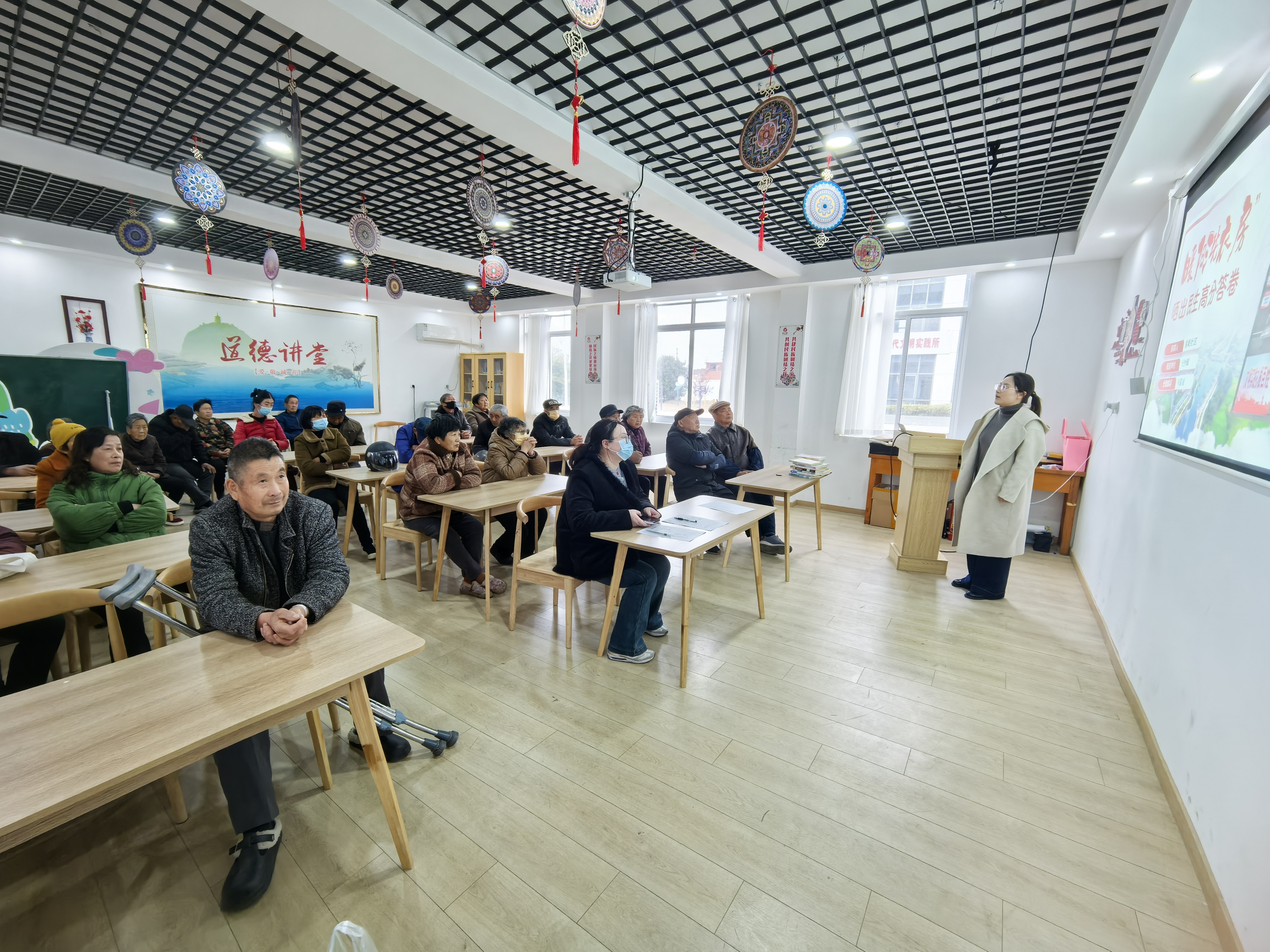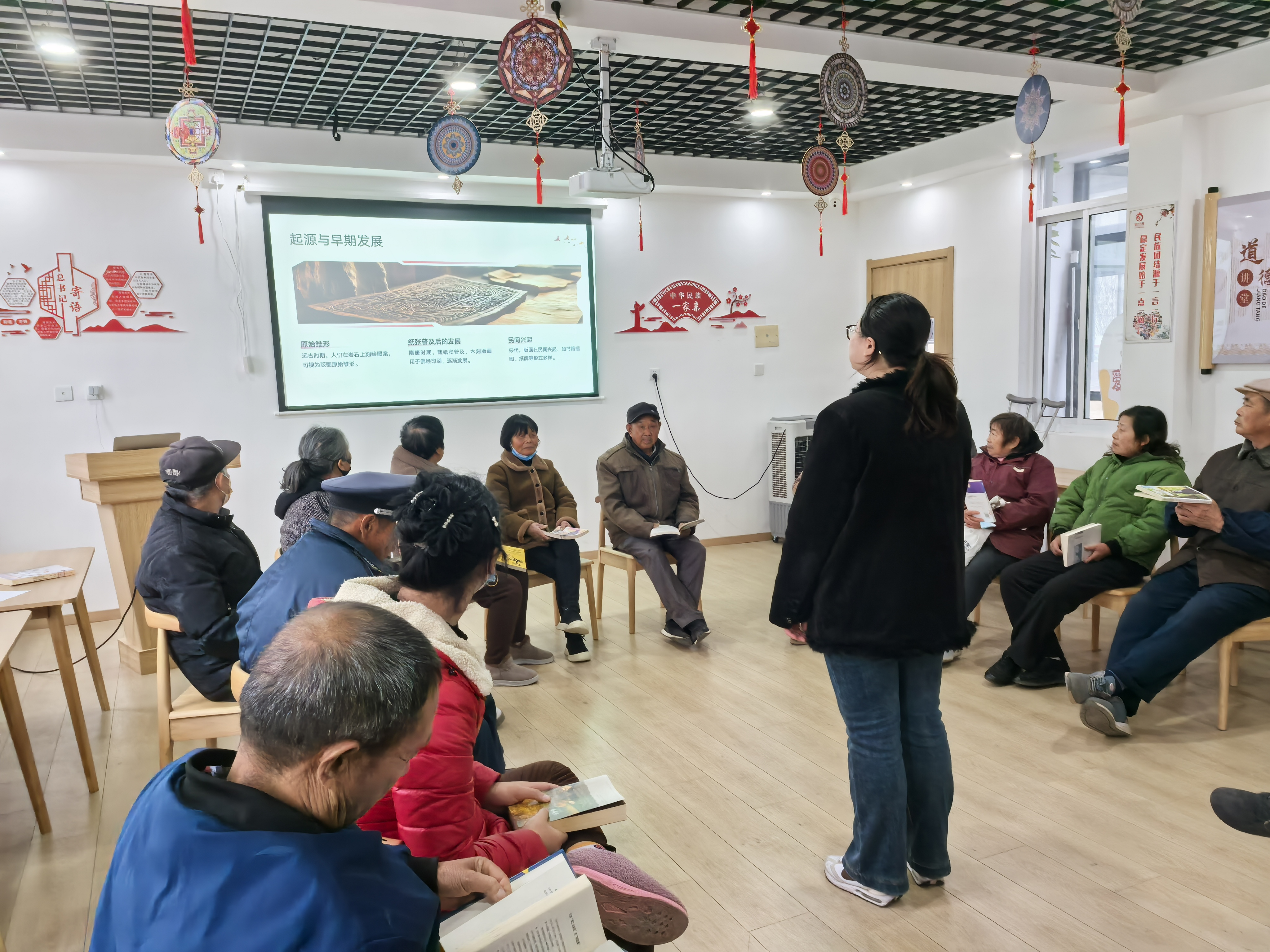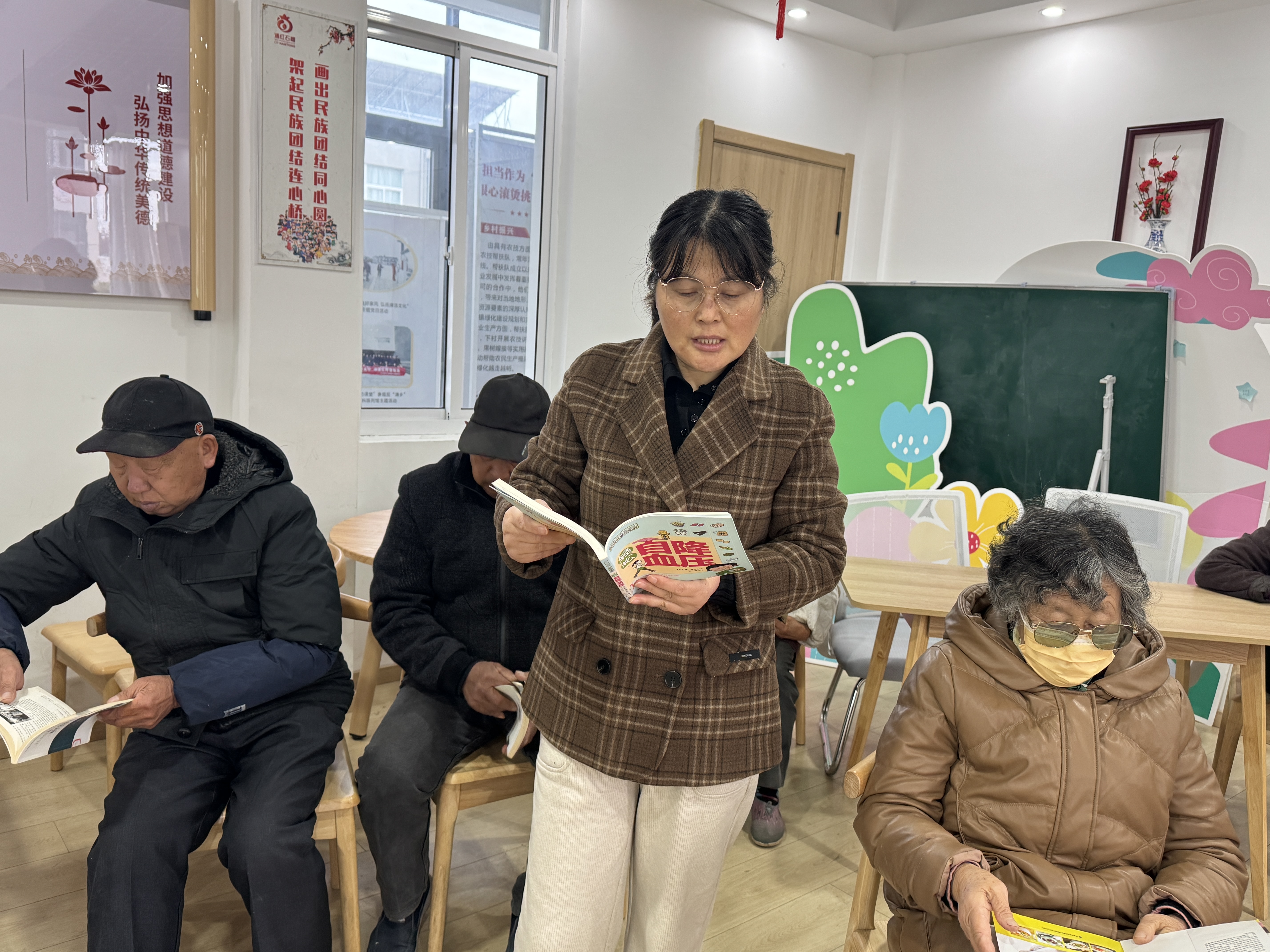 随后,长南卫生室陈医生结合冬季气候特点,围绕饮食调养、起居保暖、常见病预防和适度锻炼等内容,分享了实用易行的养生知识。分享还结合《黄帝内经》等经典养生典籍中的智慧,引导居民树立“治未病”的健康理念,安然过冬。最热闹的当数“阅读分享与互动”环节。居民们相互交流自己的养生“小妙招”。大家就冬季健康困惑相互讨论,现场气氛热烈,欢声笑语不断。