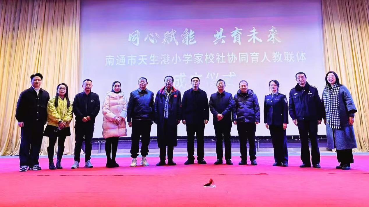 中国江苏网讯 12月24日,天生港小学举行“家校社协同育人教联体”成立仪式。崇川区教育体育局副局长管小冬,天生港镇街道党工委副书记、关工委主任张伟,长江航运公安局南通分局团委书记屠欣然,天生港派出所陈俊警官等嘉宾代表,以及各社区负责人、家长代表、学校师生代表等百余人齐聚一堂,共同见证这一区域教育协同发展的重要时刻。