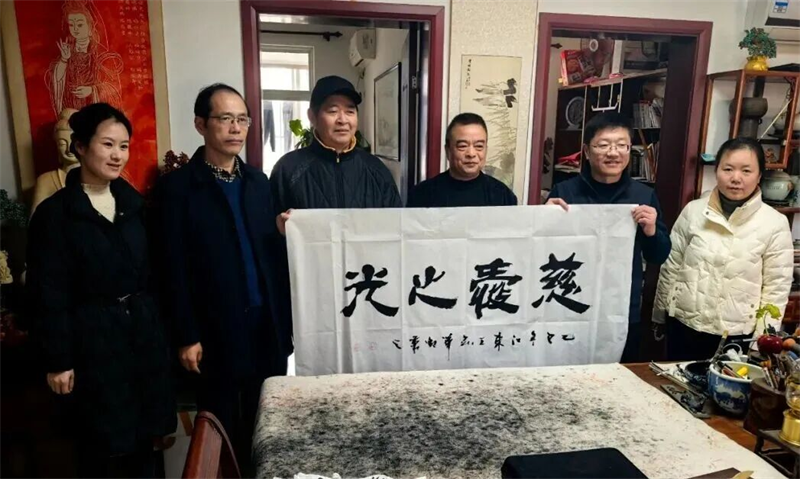 慰问现场,王剑华怀着感恩之心,用口衔笔写下“慈爱之光”四个大字,笔锋间满是对慈善事业的崇敬和对关怀的回应,让在场众人深受触动。