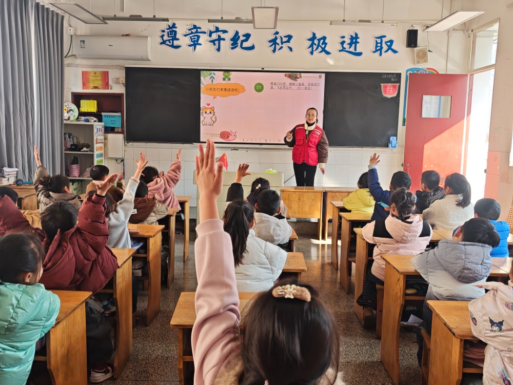 “小朋友们平时都喜欢去哪儿玩呀?”活动伊始,志愿者的提问瞬间拉近了与孩子们的距离。教室里响起此起彼伏的抢答声,一张张稚嫩的脸庞写满好奇与热情。“黑夜闪闪亮,像颗小星星。”“身小力不小,团结又勤劳。”随后,志愿者巧妙切入主题,抛出一连串关于昆虫的趣味谜语。“是萤火虫!”“是小蚂蚁!”孩子们争相举手,高声抢答。简单的互动,不仅点燃了课堂气氛,锻炼了思维,也自然而然地将孩子们引入了奇妙的昆虫王国。