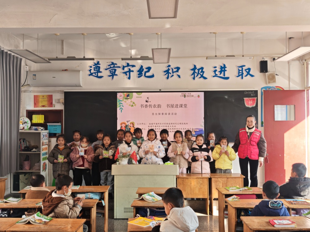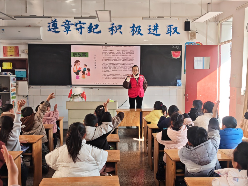 志愿者带来了法布尔的经典著作《昆虫记》,以“会织网的蜘蛛”为切入点,用生动活泼的语言,配以鲜活逼真的图片,为孩子们讲述蜘蛛结网的智慧。孩子们听得目不转睛,时而为昆虫的机智惊叹,时而为自然的奥秘着迷。故事讲完,志愿者围绕内容提问互动。“蜘蛛的网为什么不会粘住自己呀?”问题一出,小手林立:“我知道!蜘蛛脚上有滑滑的东西,就像涂了油一样!”踊跃的发言、欢快的笑声充盈课堂,知识的芬芳与阅读的乐趣在互动中悄然传递。